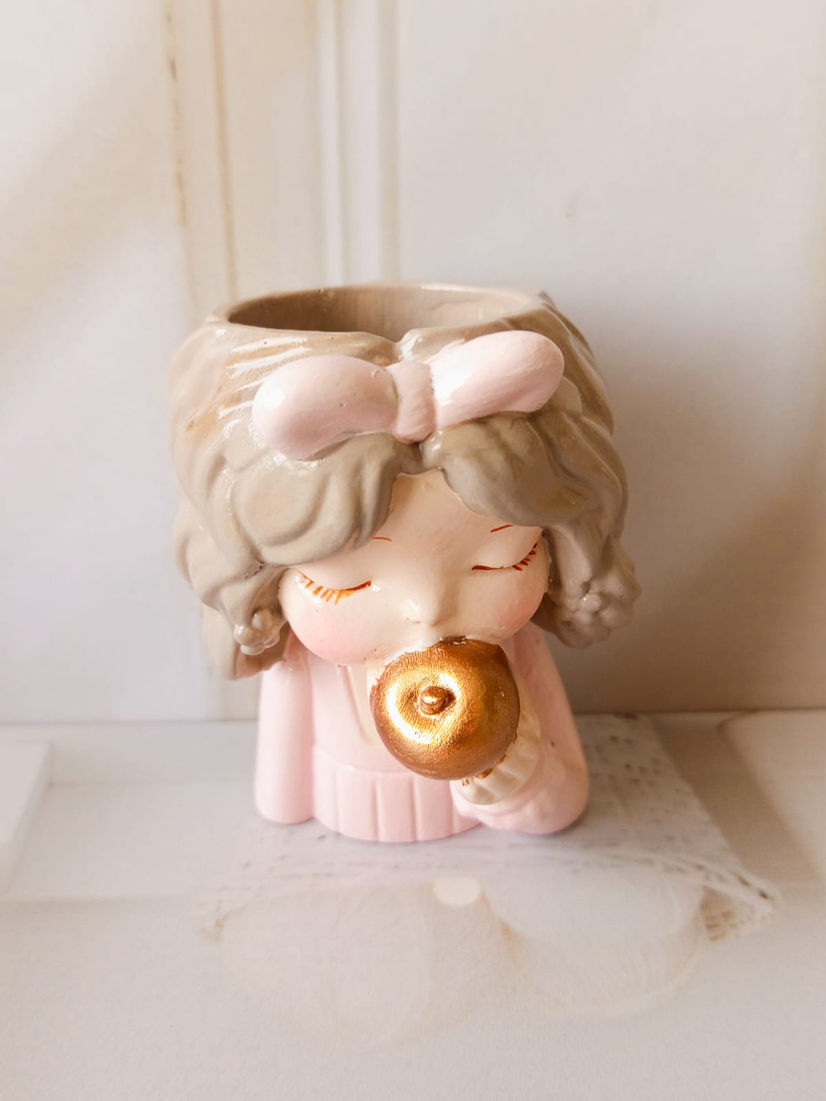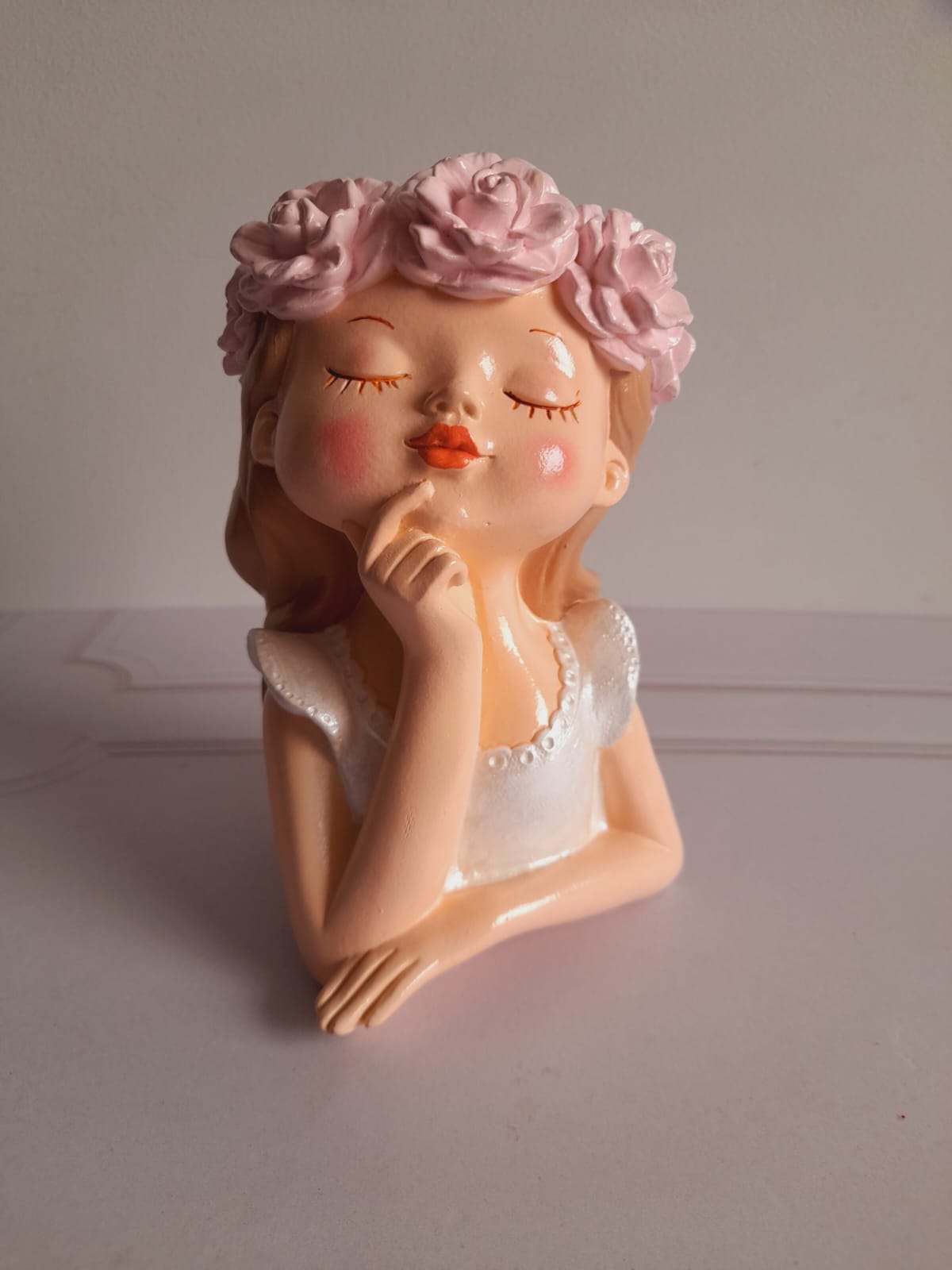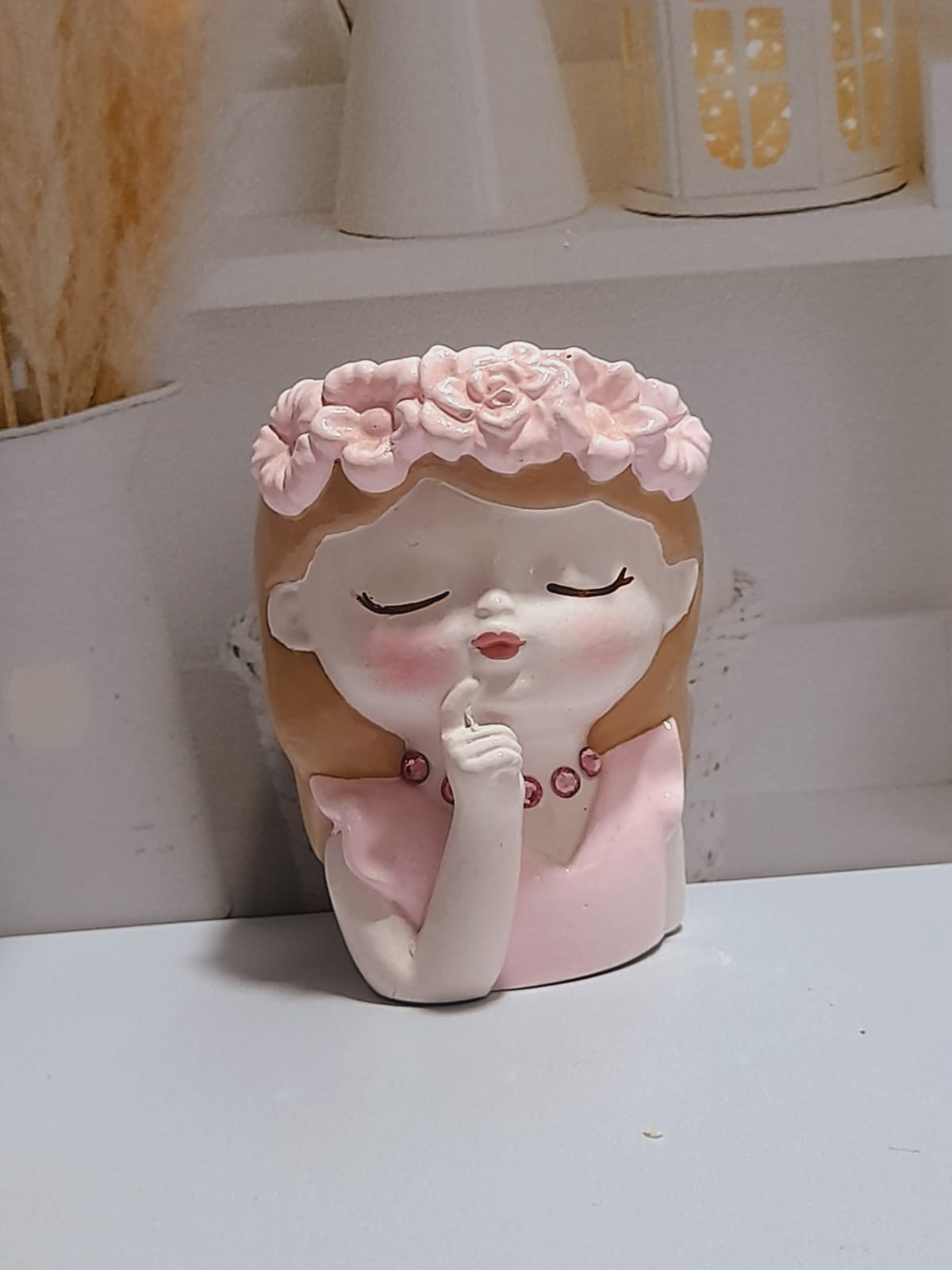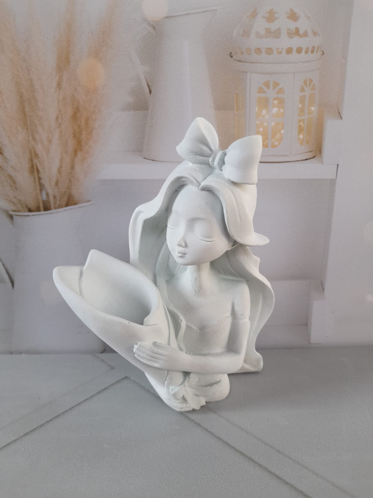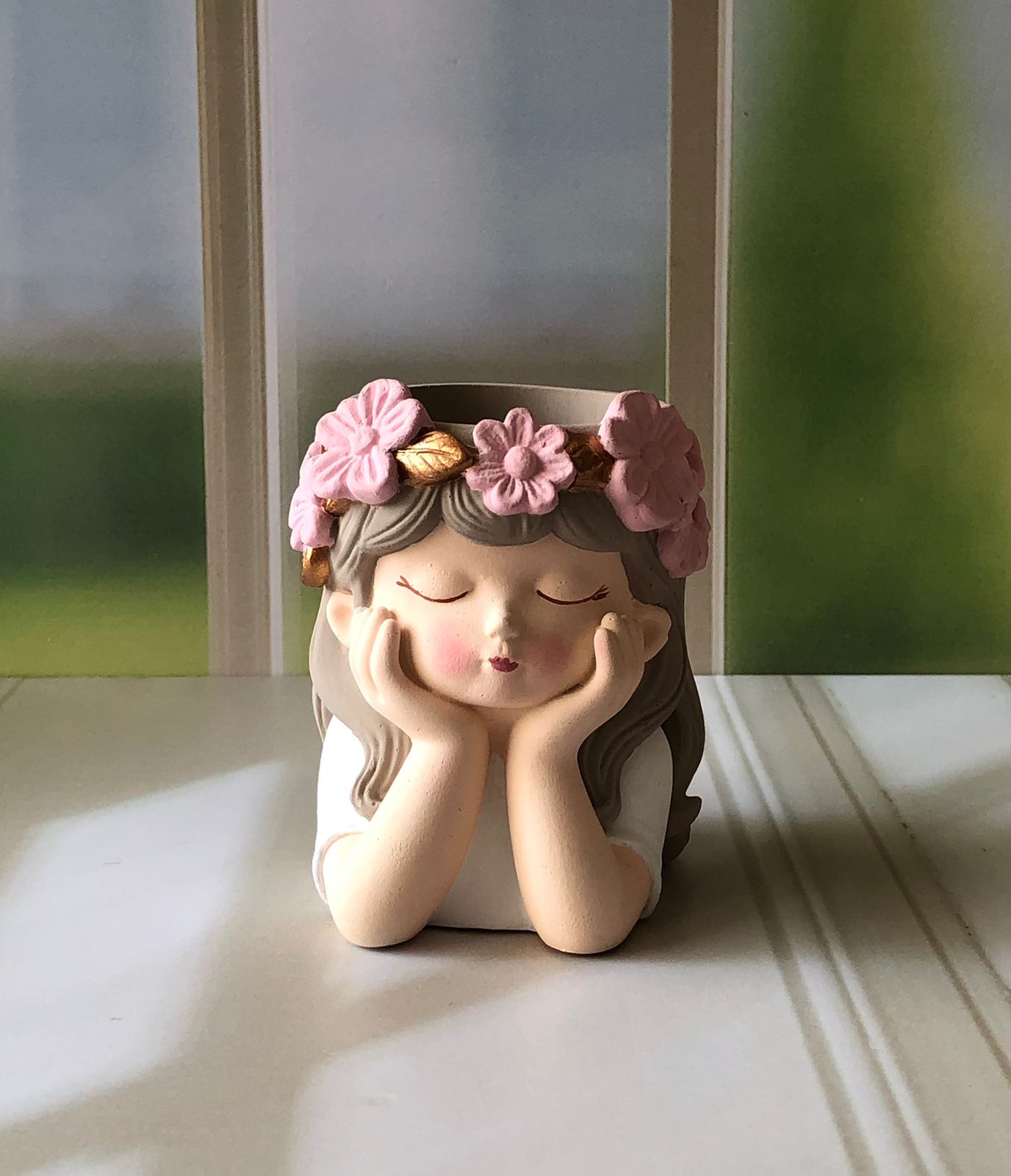 Maceta Nina con Vincha, material cemento blanco, altura 10.5cm, peso 520g