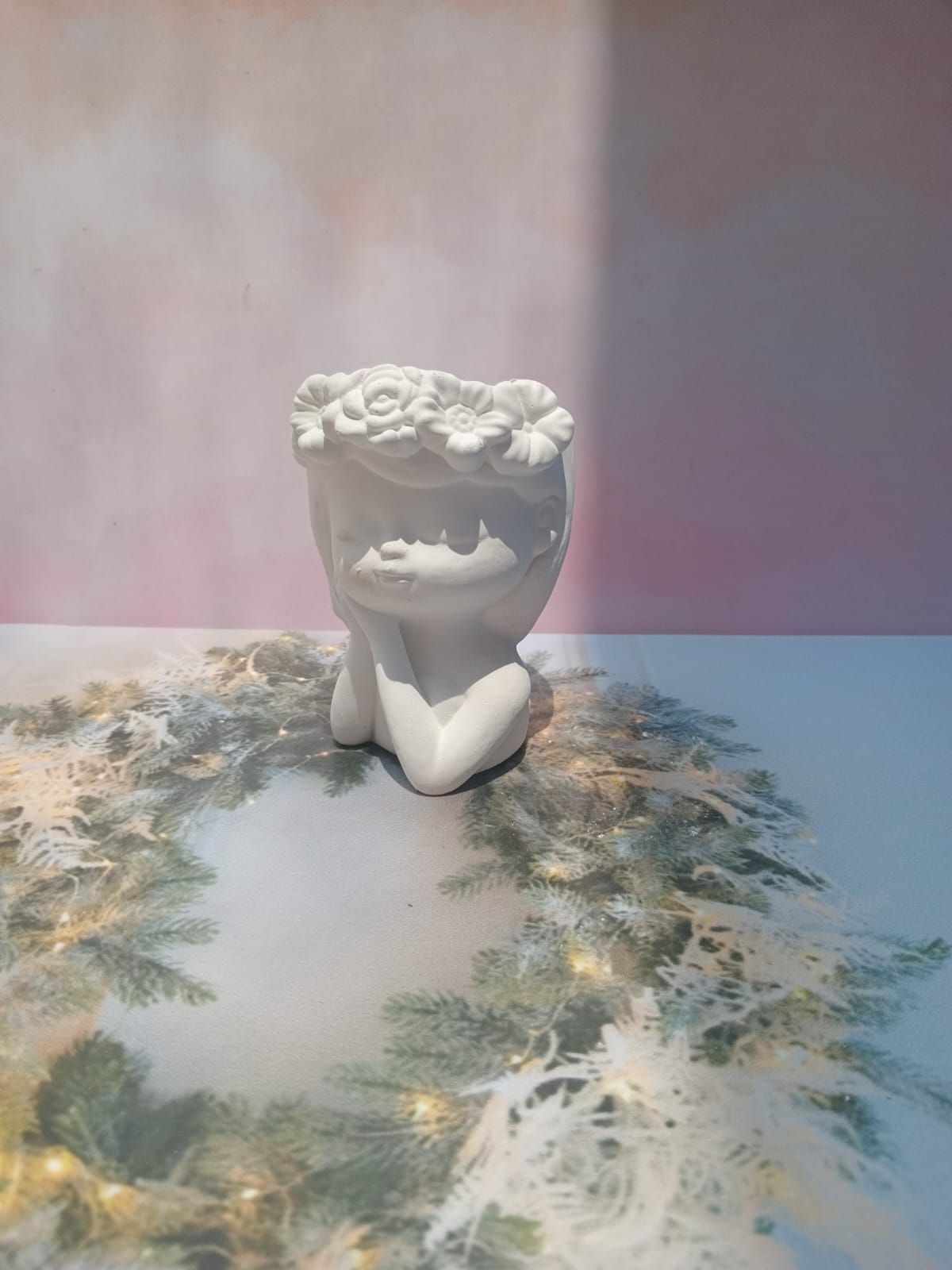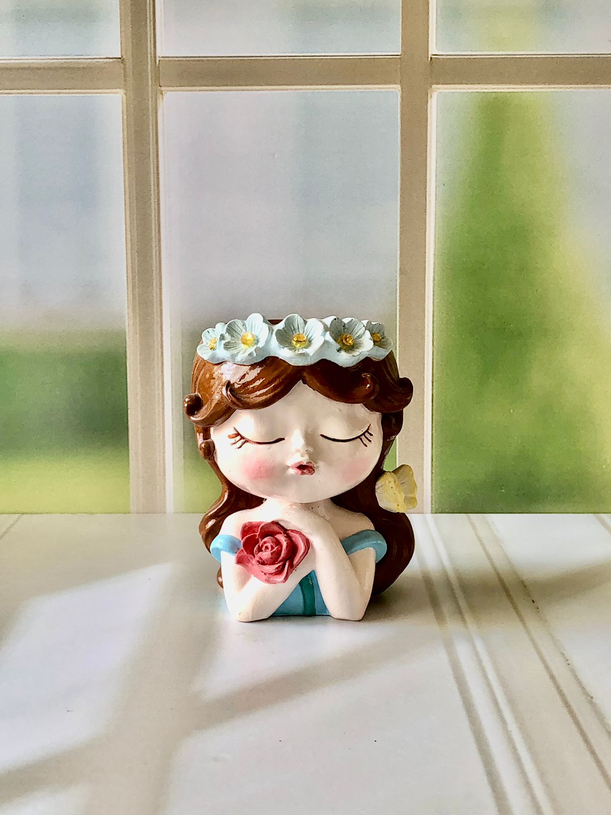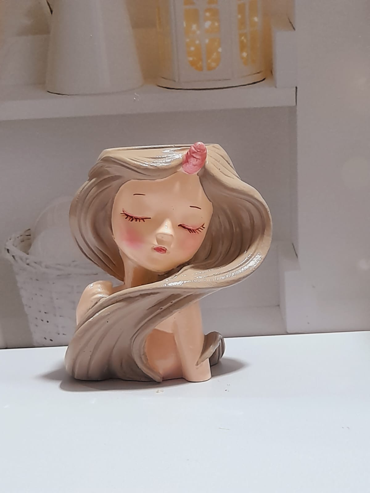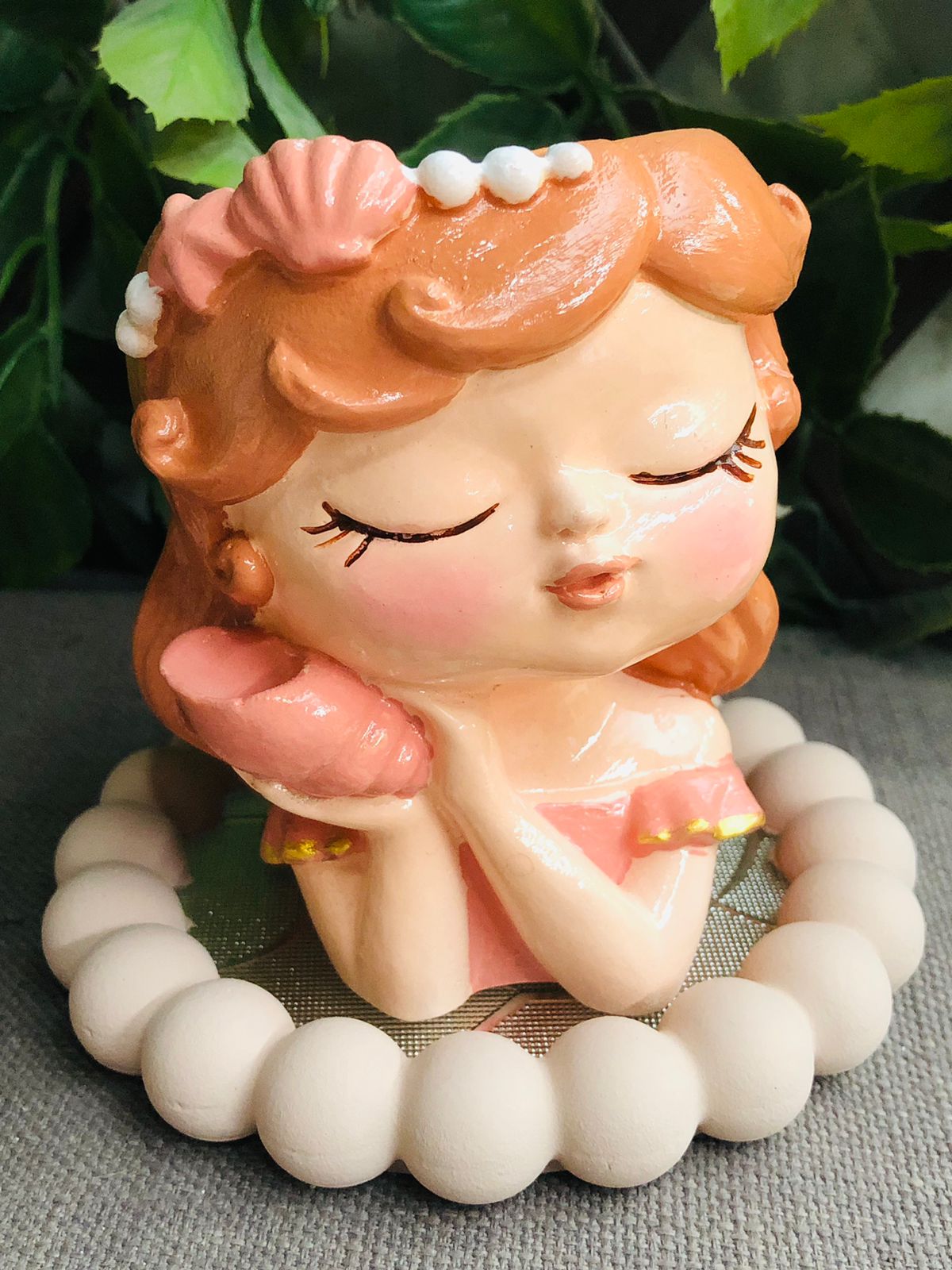 Maceta Nina con Vincha, material cemento blanco, altura 10.5cm, peso 520g