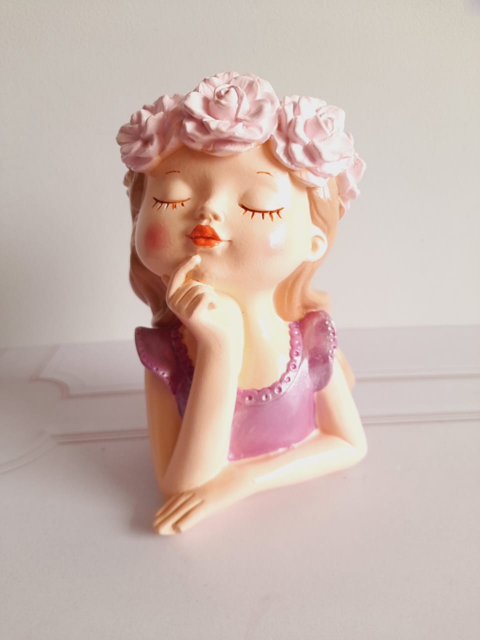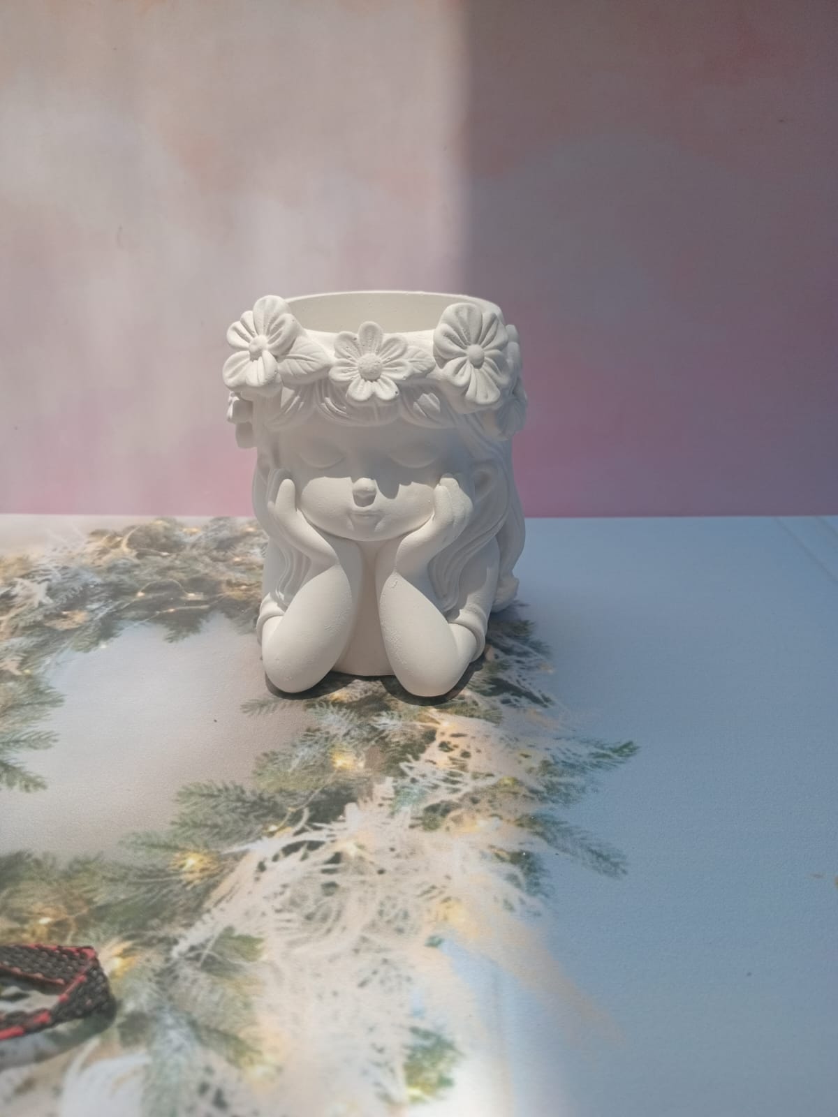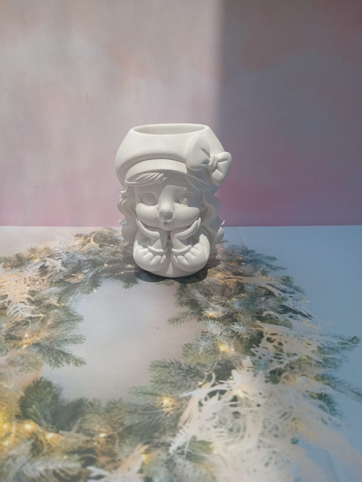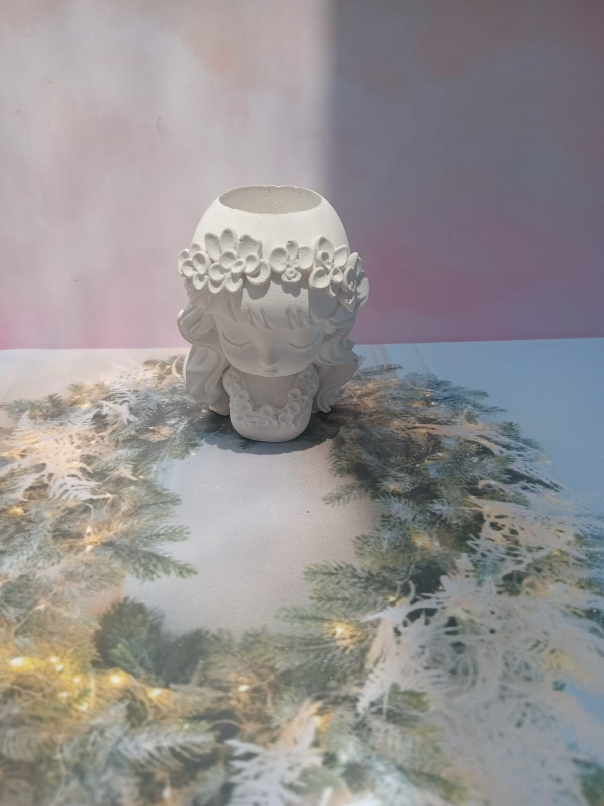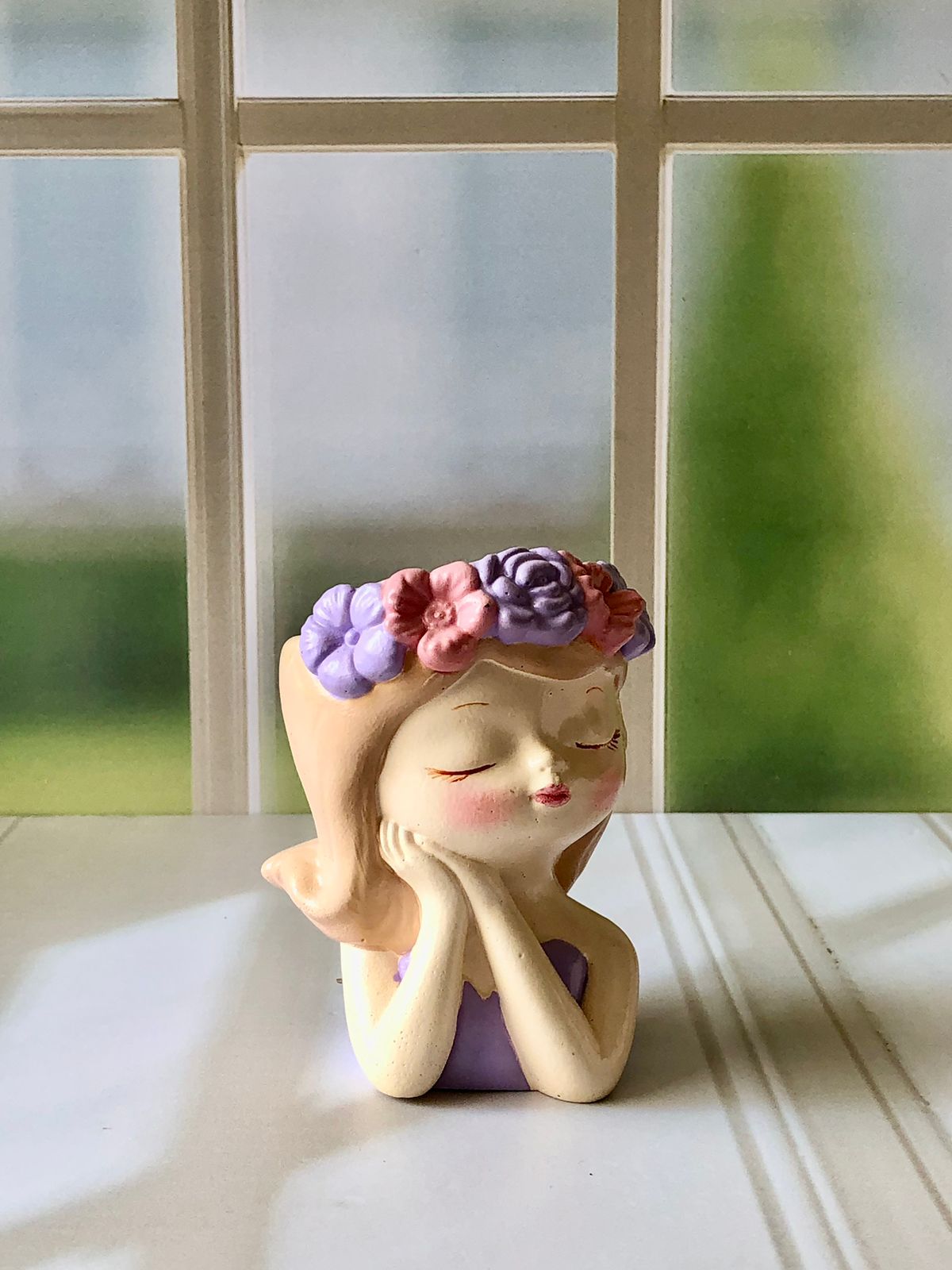 Maceta Nina con Vincha, material cemento blanco, altura 10.5cm, peso 520g