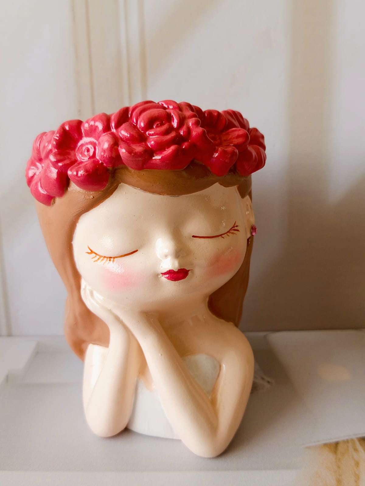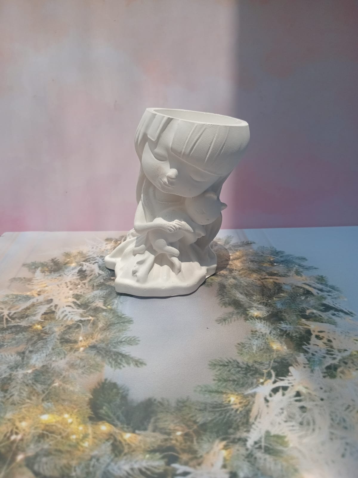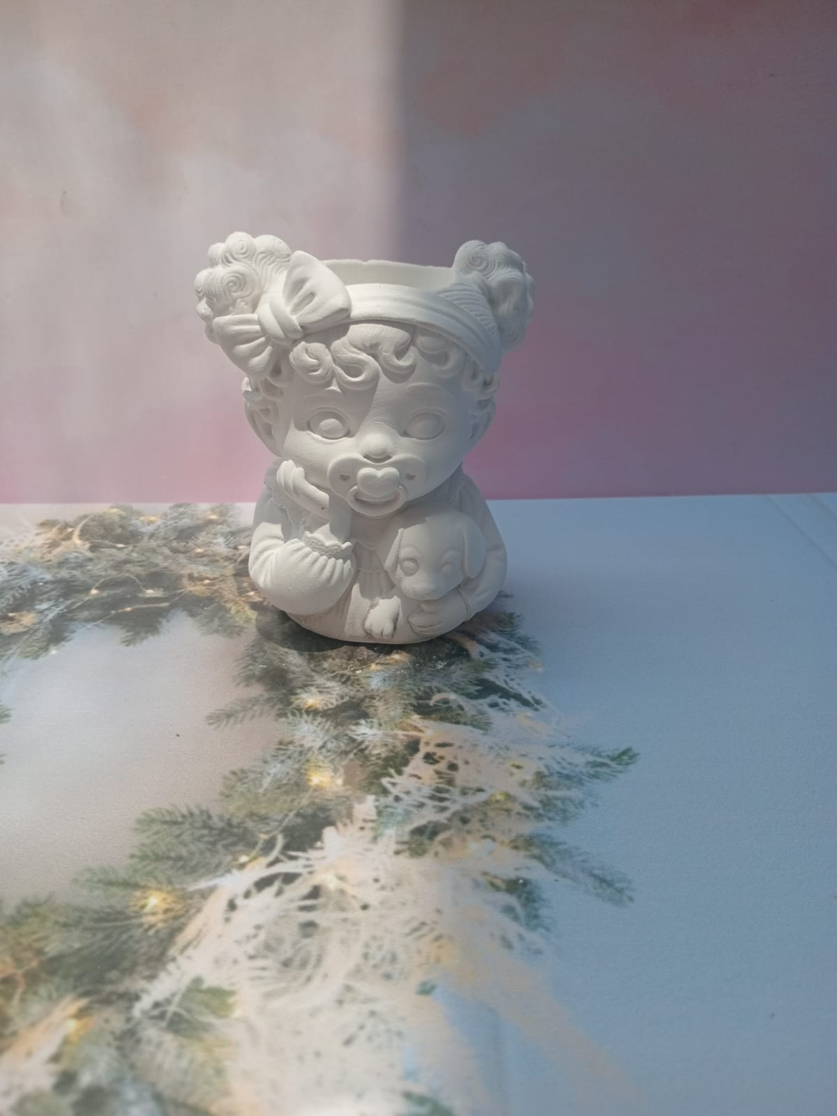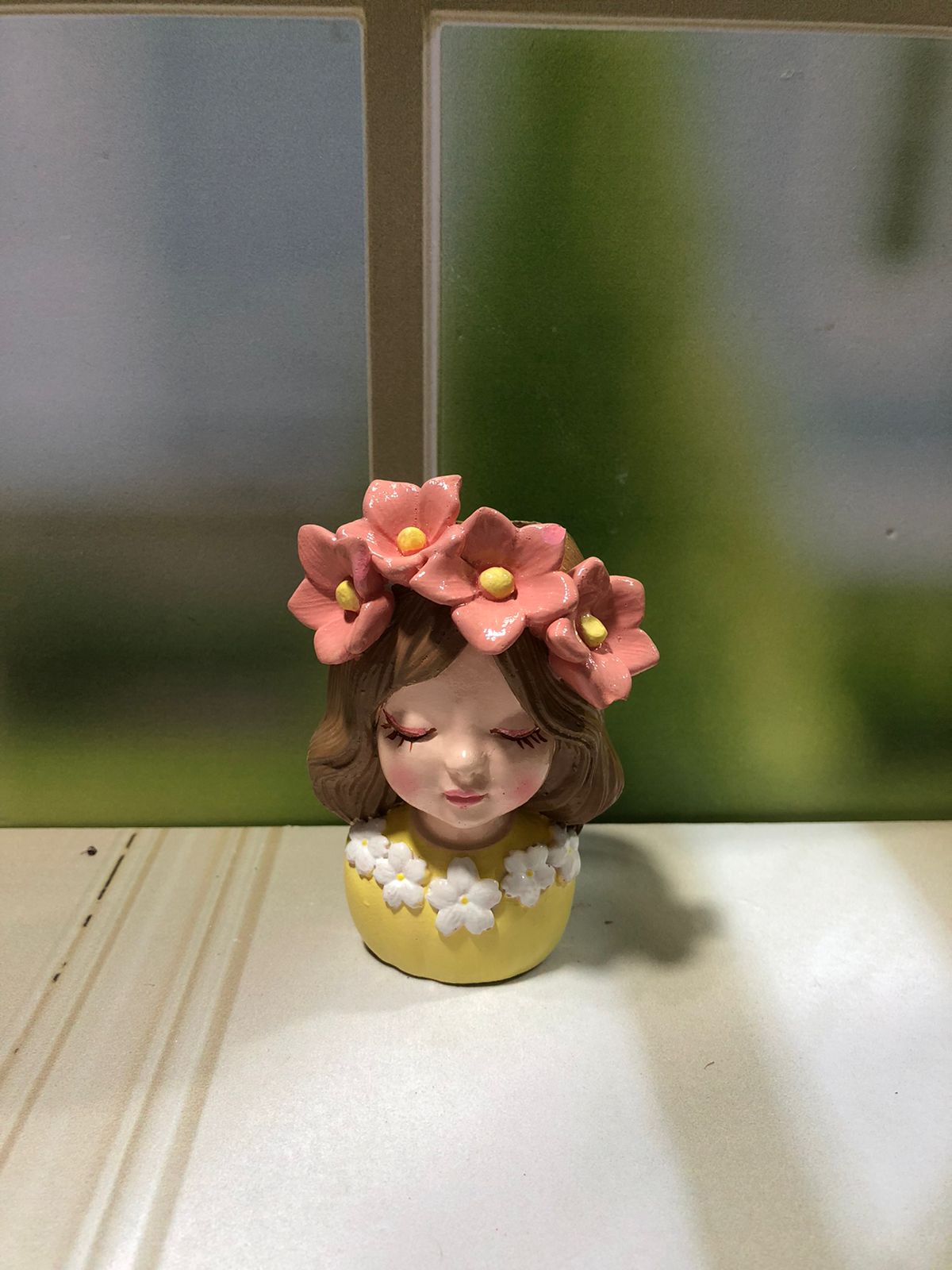 Maceta Nina con Vincha, material cemento blanco, altura 10.5cm, peso 520g