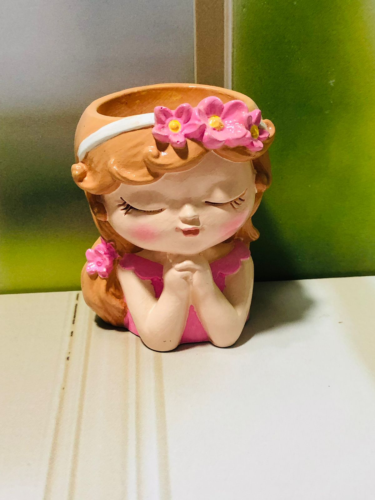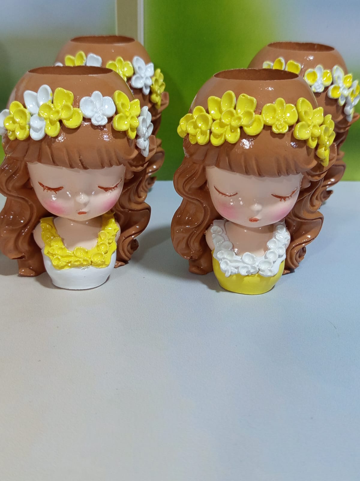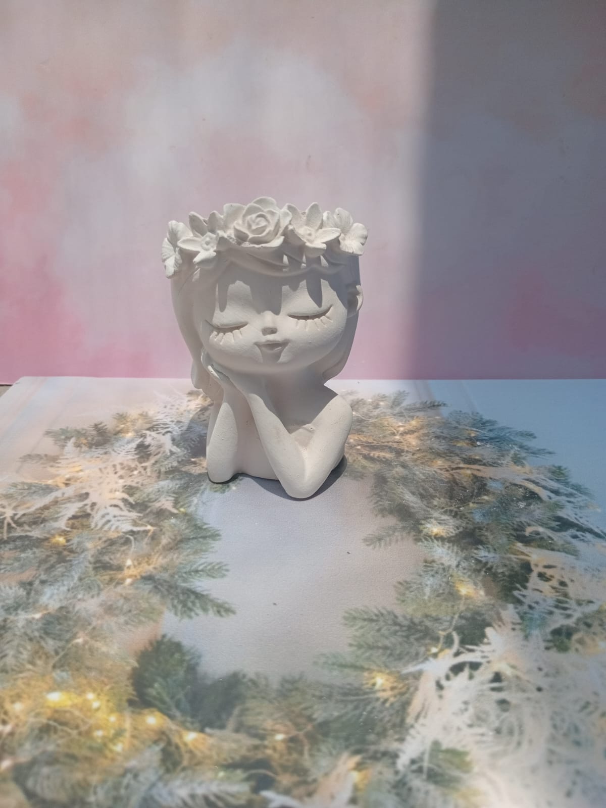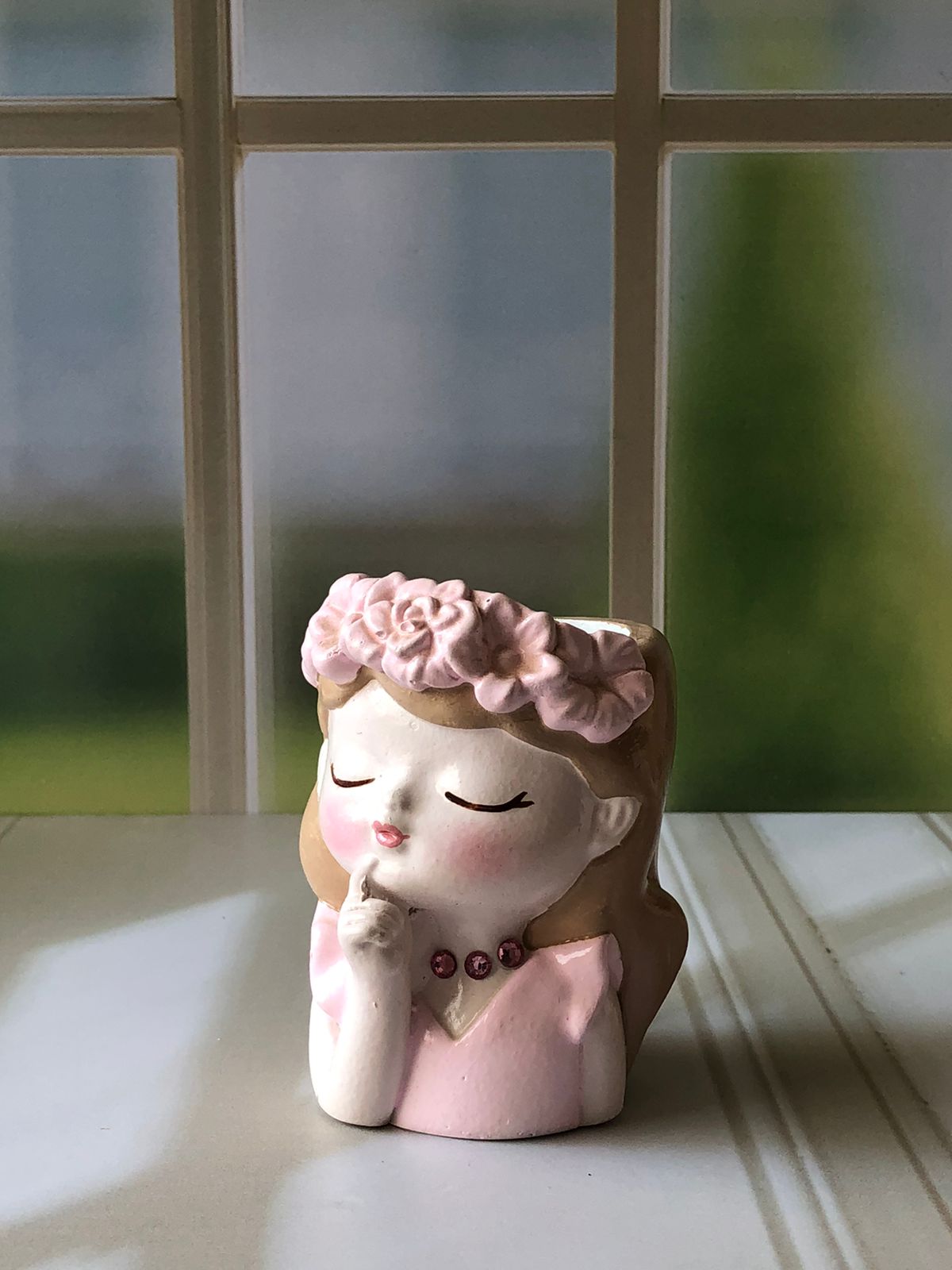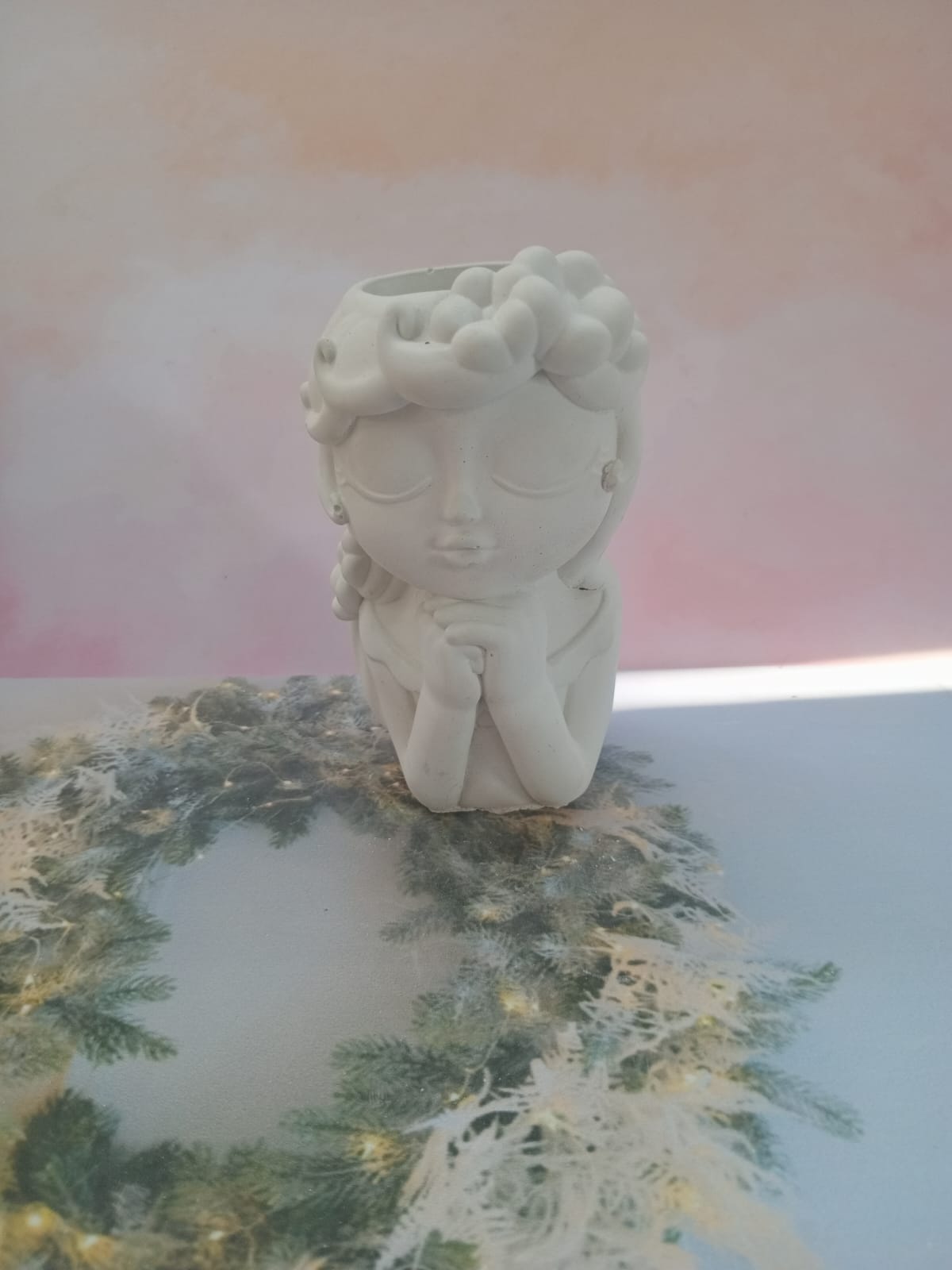 Maceta Nina con Vincha, material cemento blanco, altura 10.5cm, peso 520g