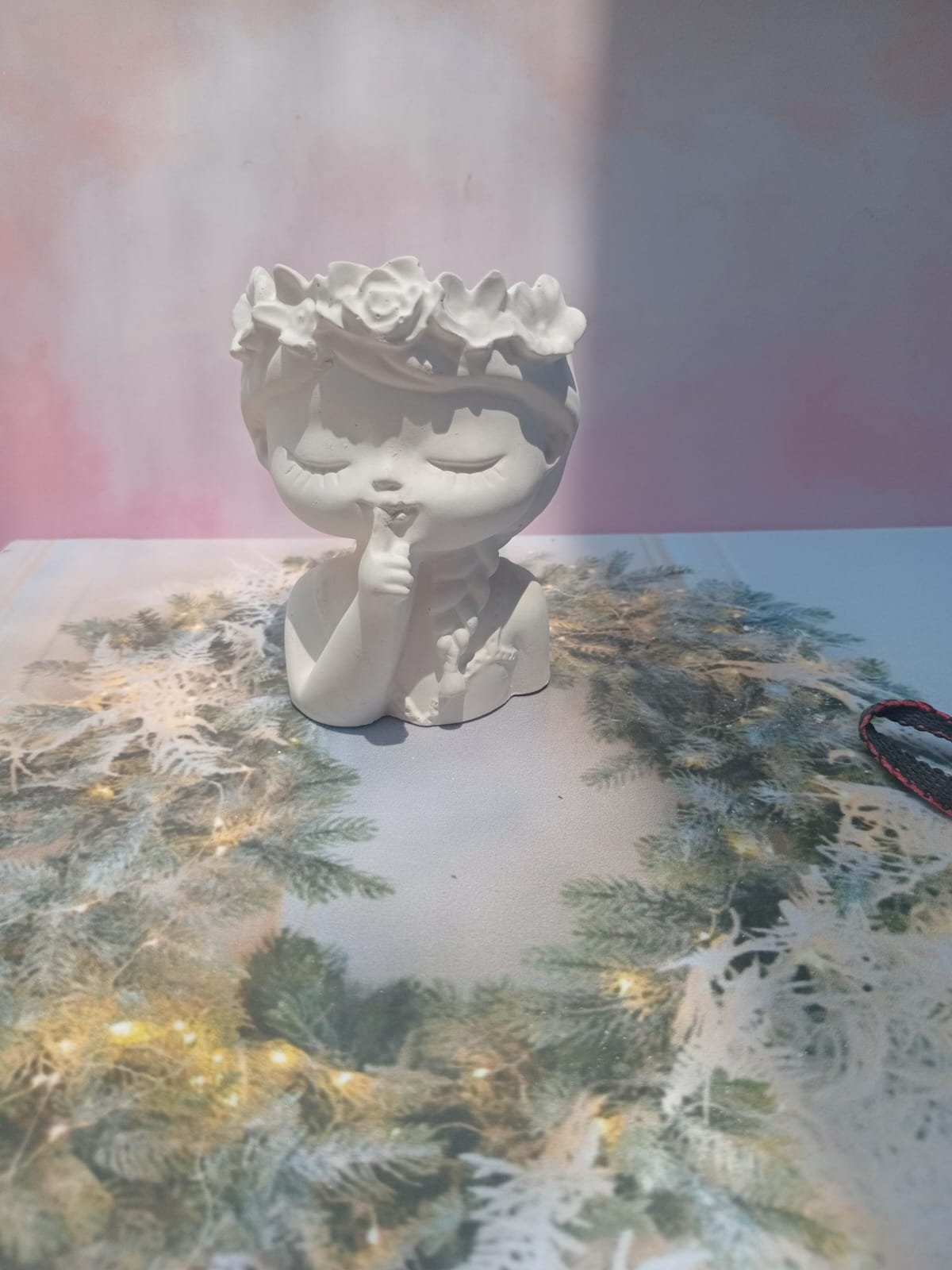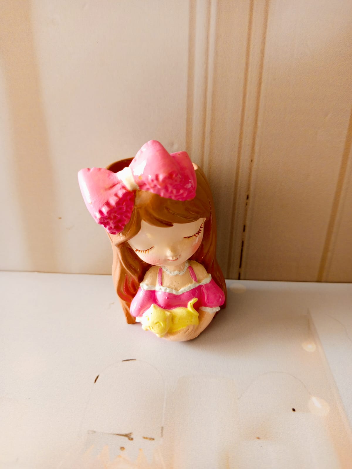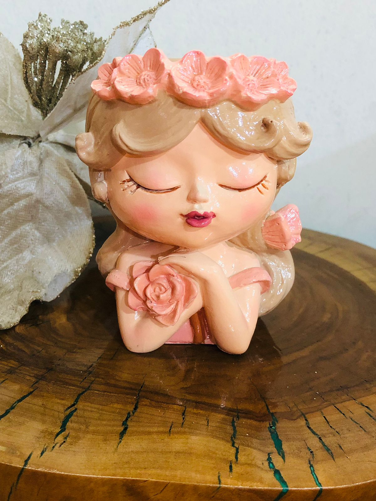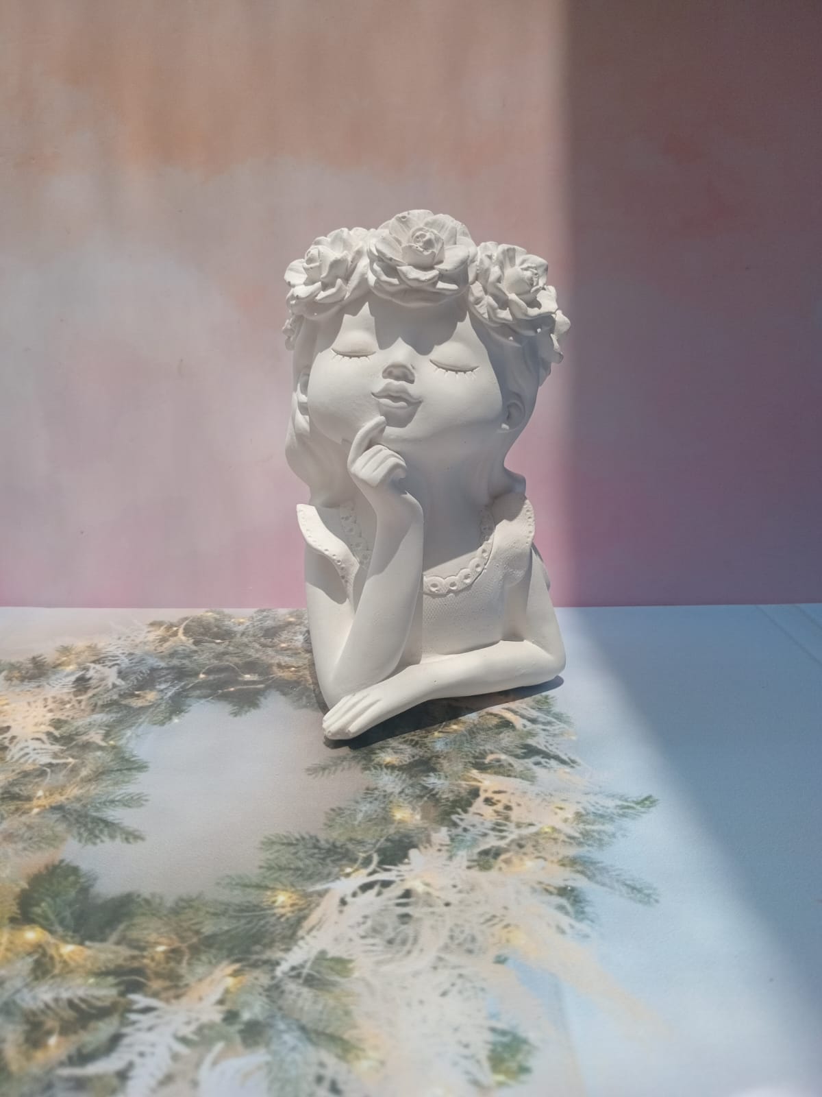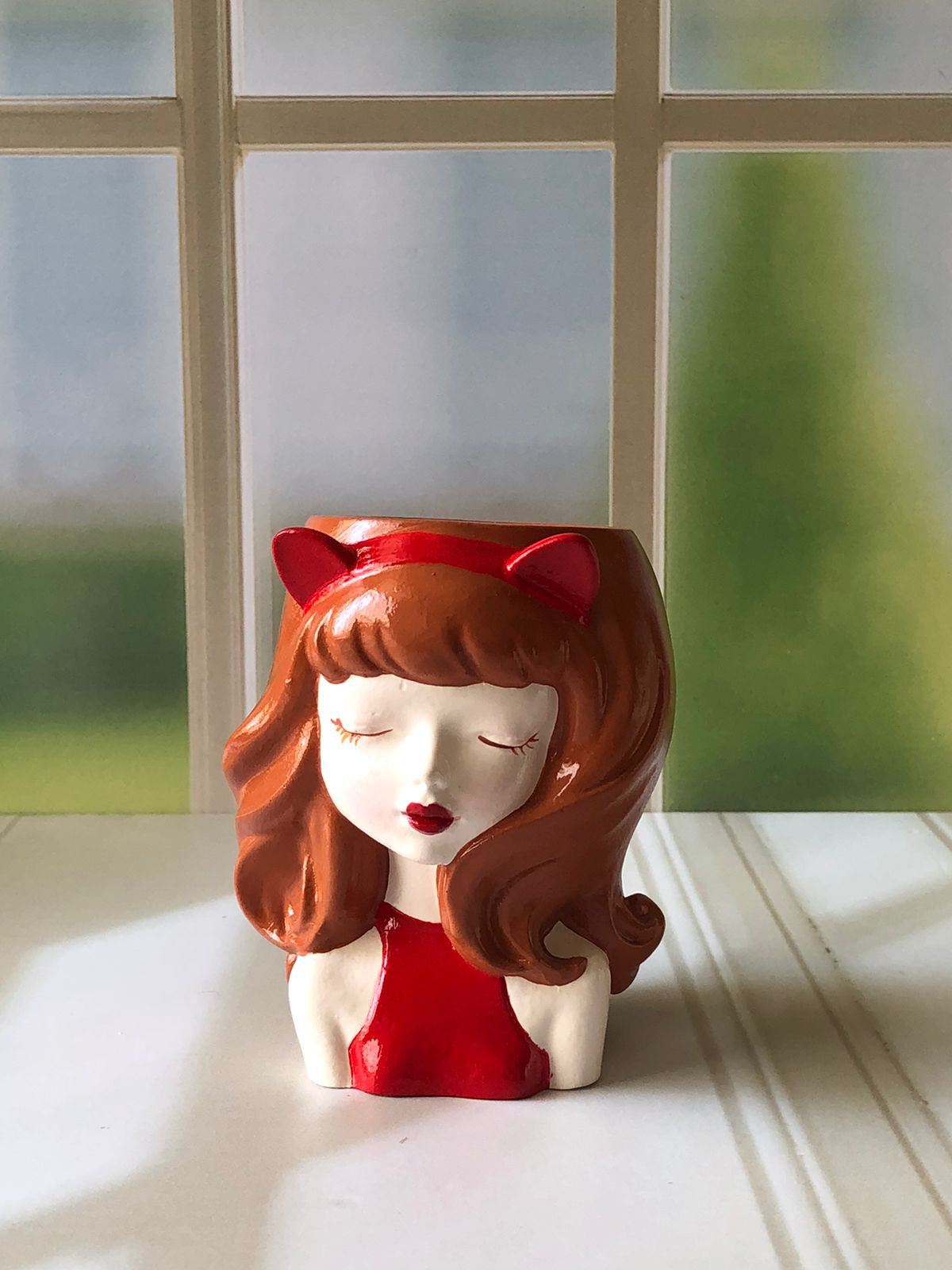 Maceta Nina con Vincha, material cemento blanco, altura 10.5cm, peso 520g