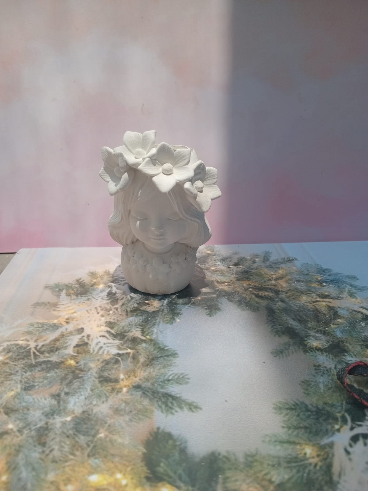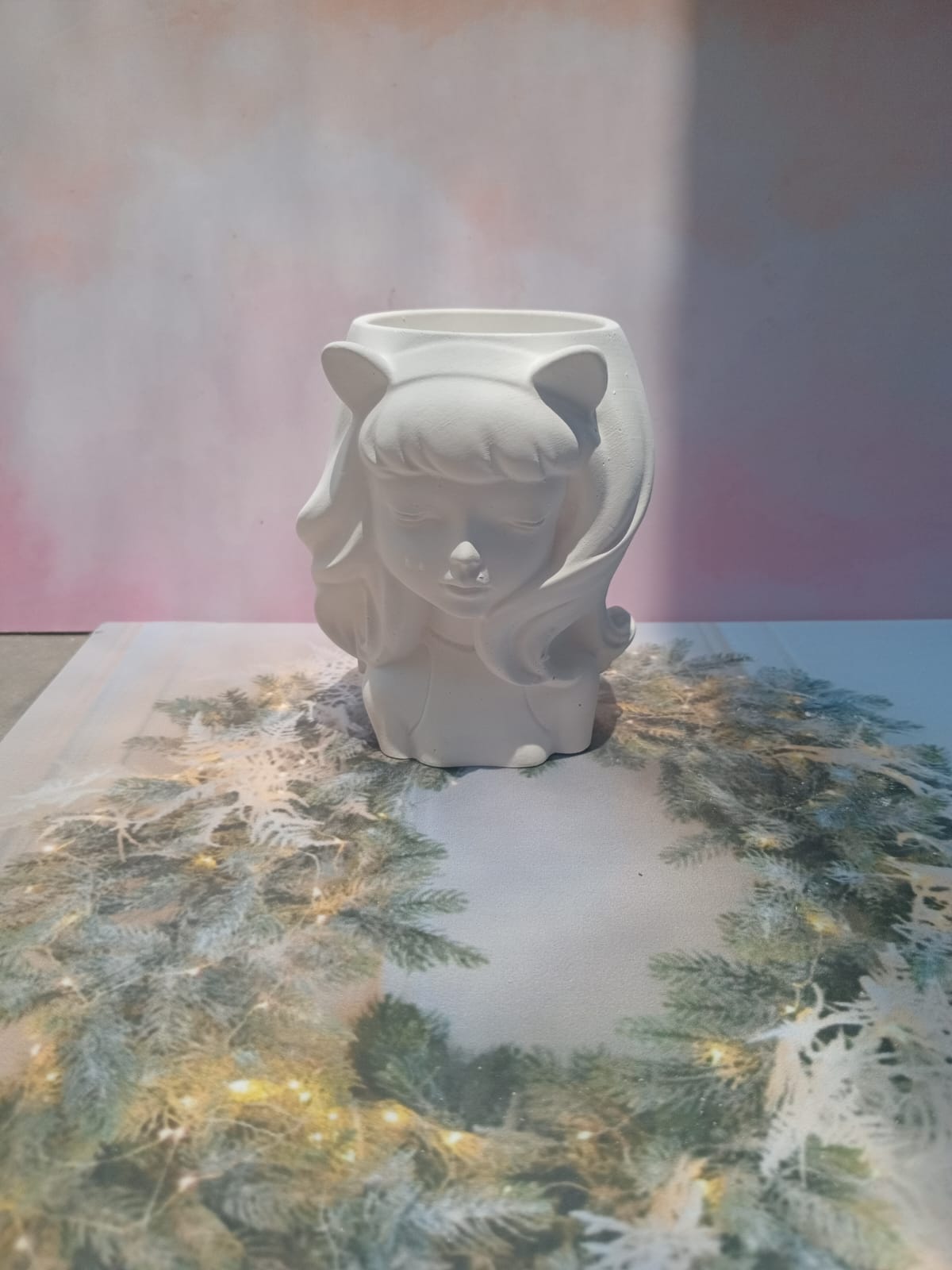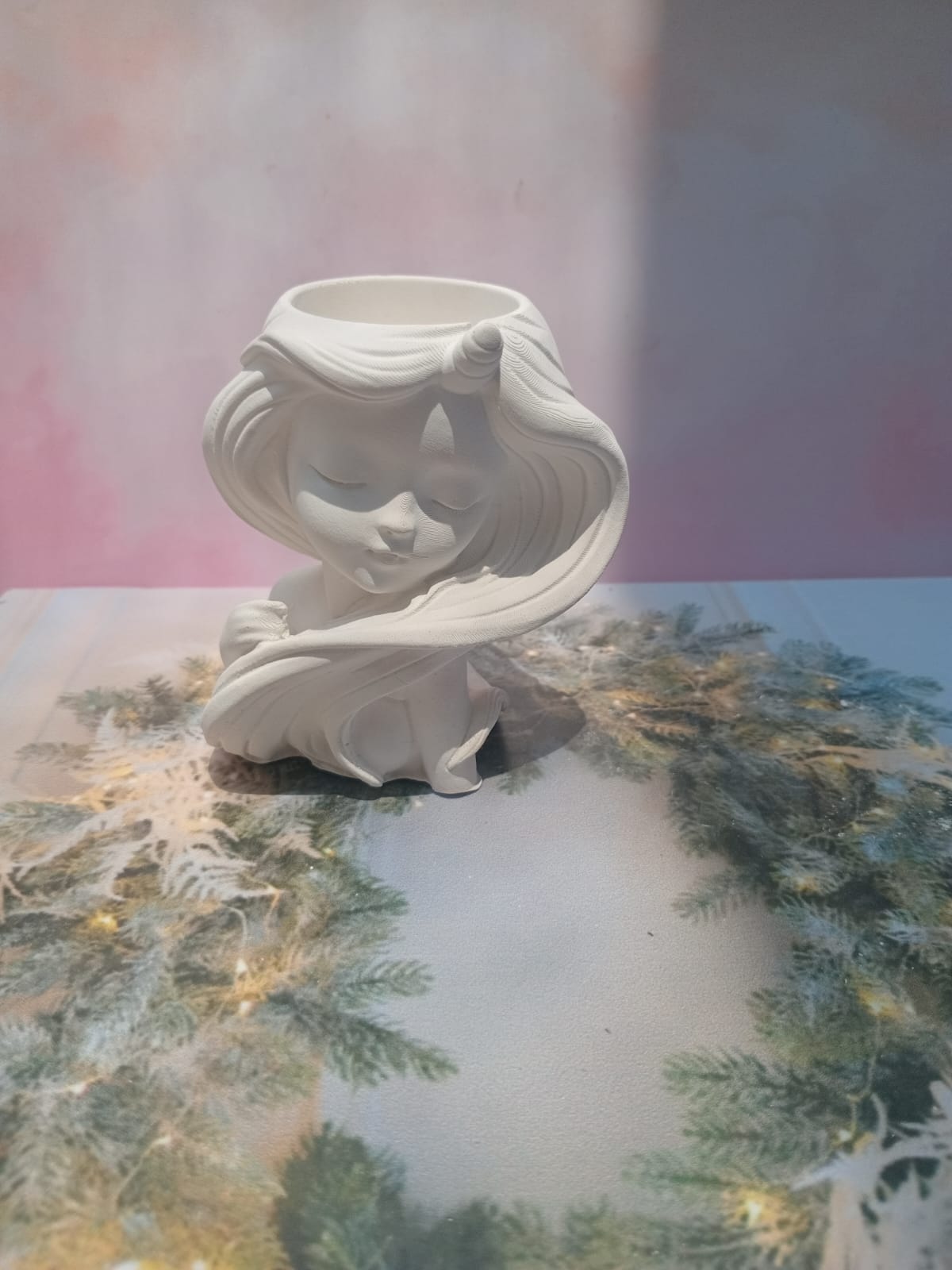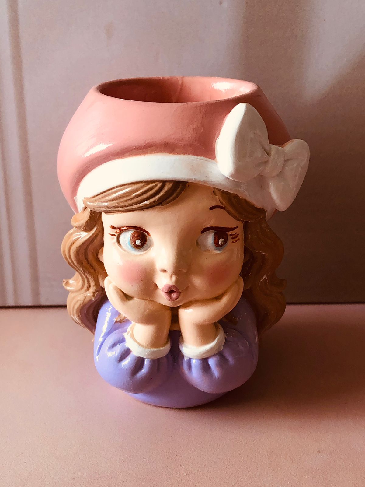 Maceta Nina con Vincha, material cemento blanco, altura 10.5cm, peso 520g