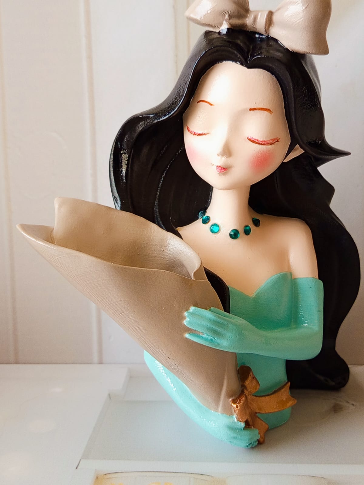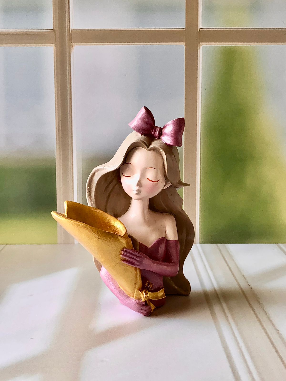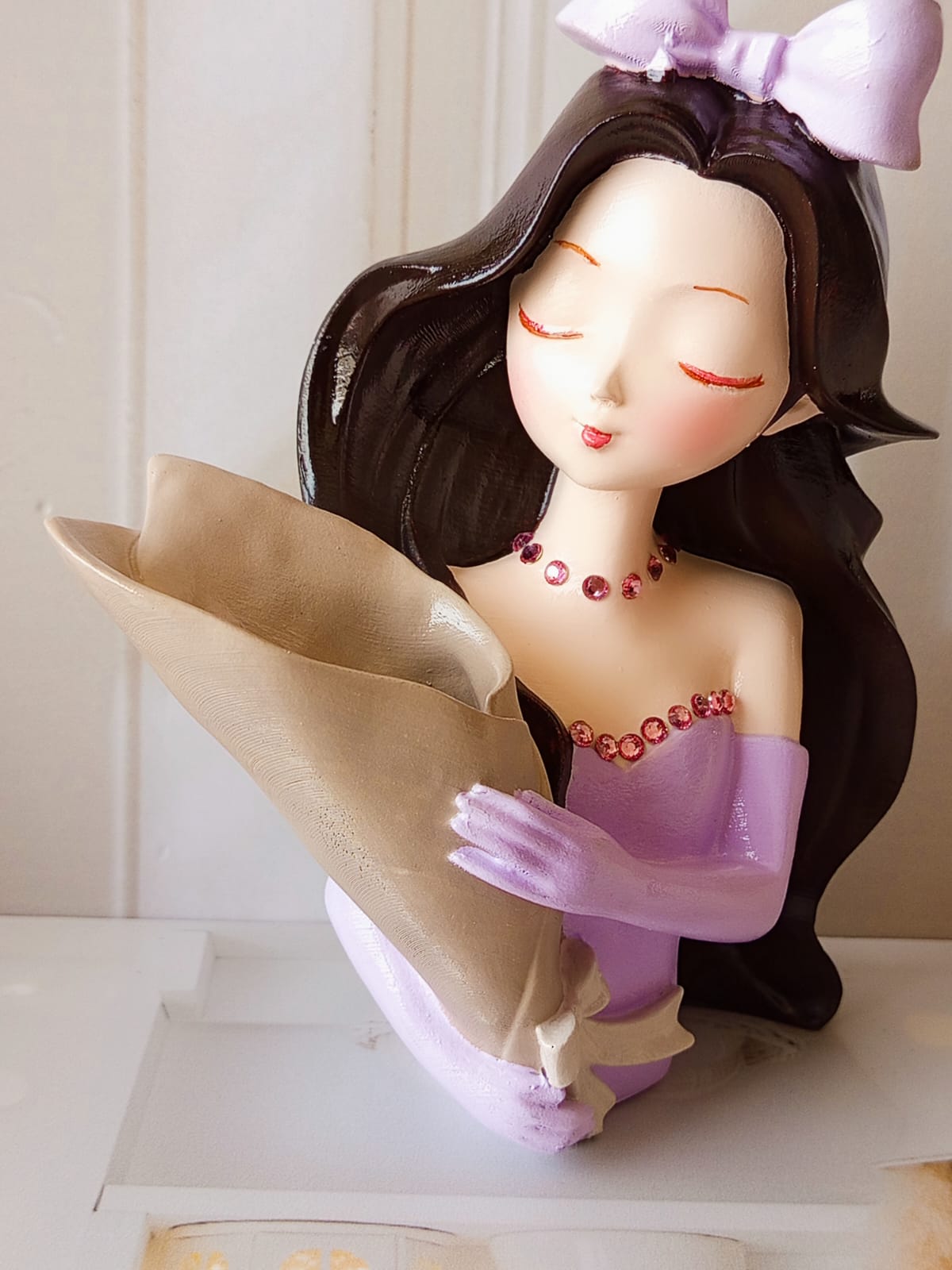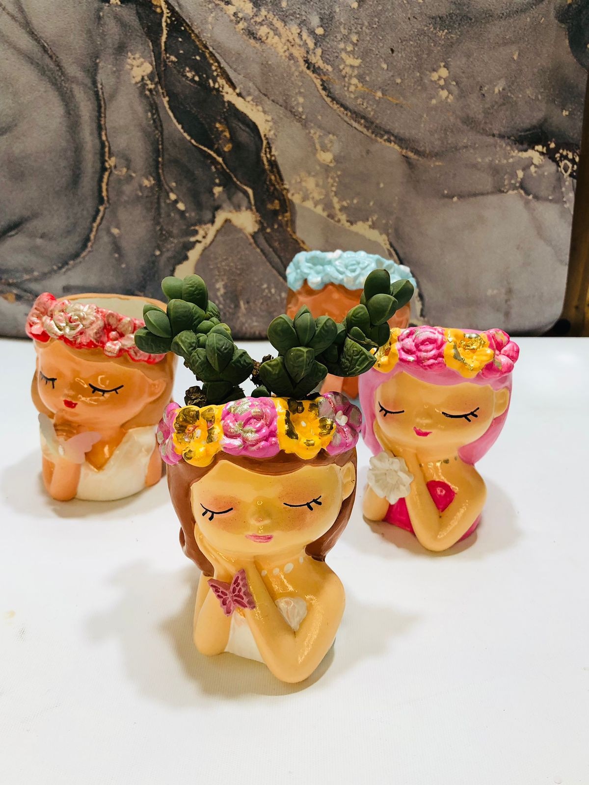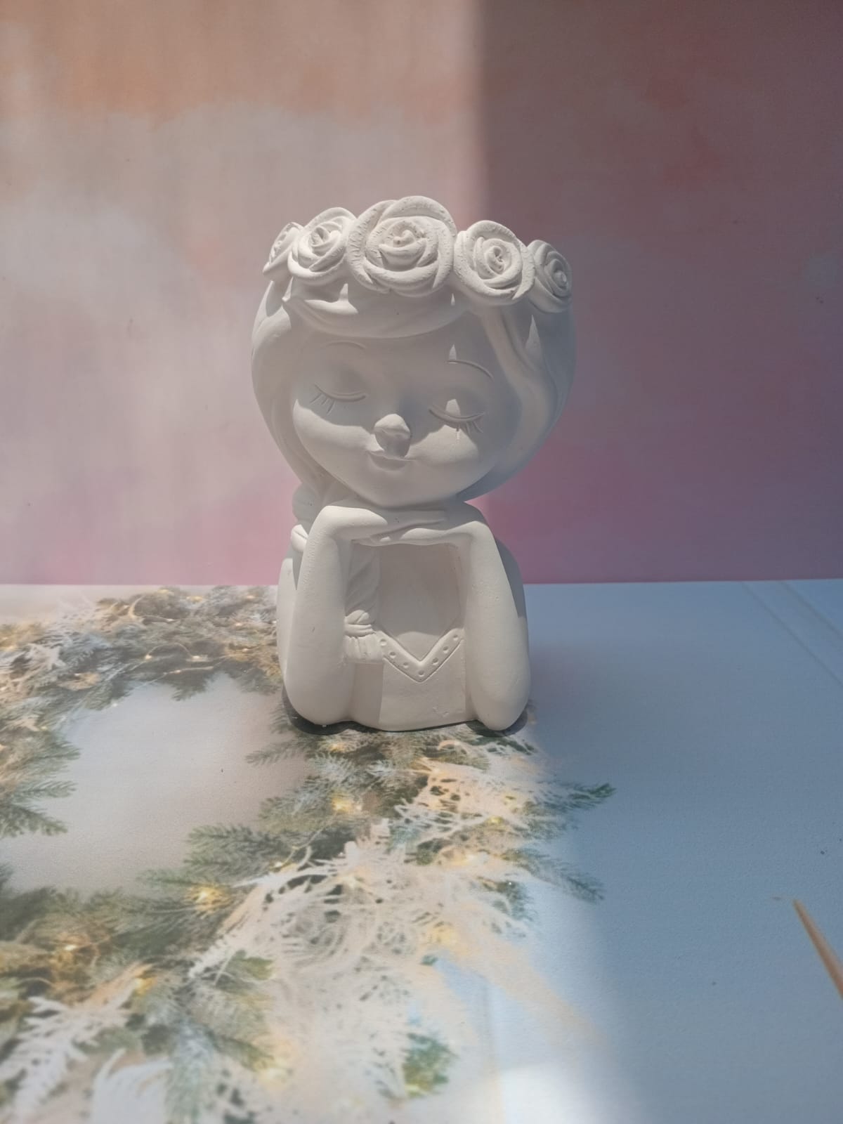 Maceta Nina con Vincha, material cemento blanco, altura 10.5cm, peso 520g