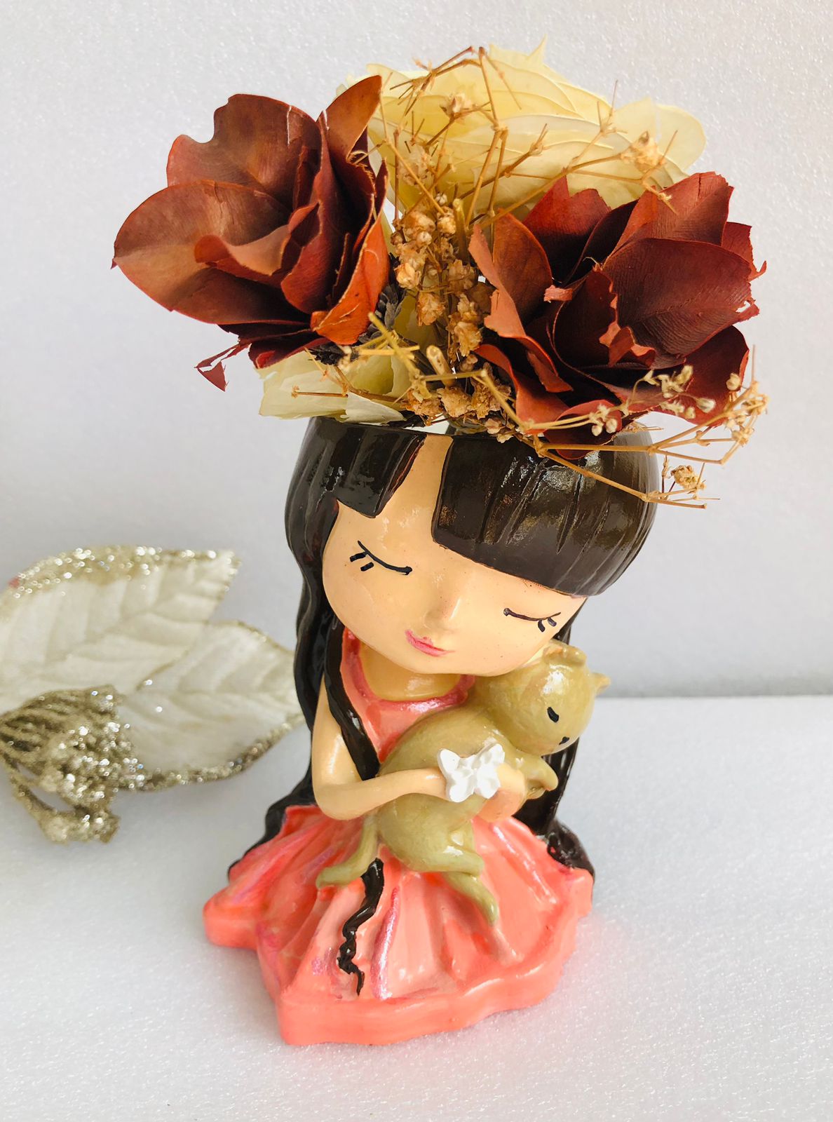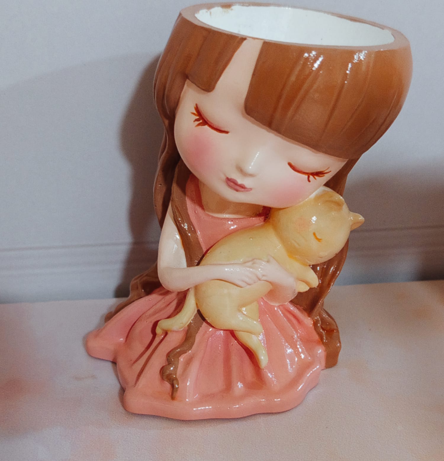 Macetita Nina con Gato, material cemento blanco, altura 10cm, peso 370g