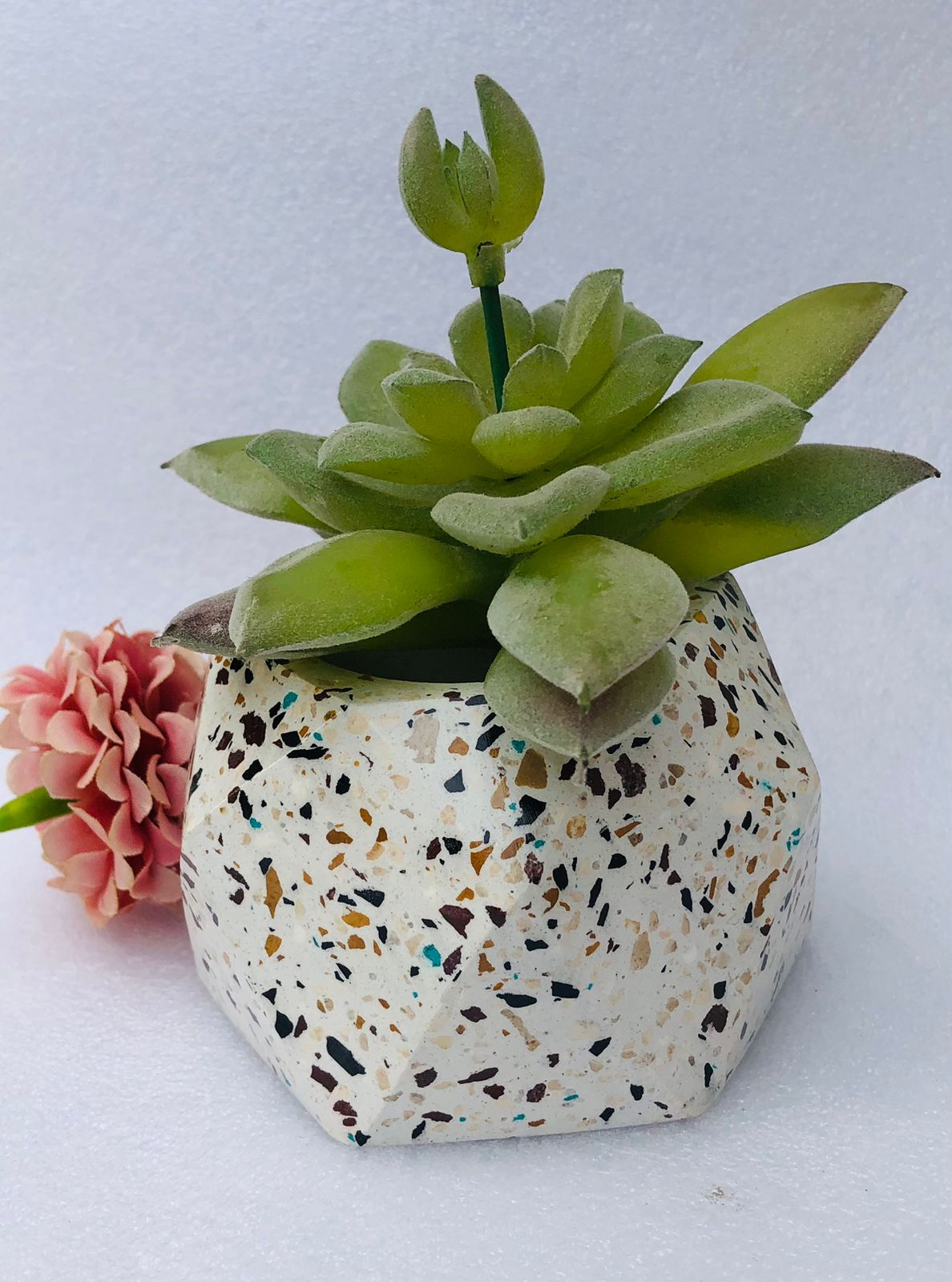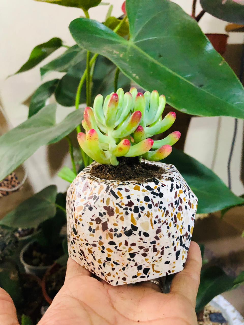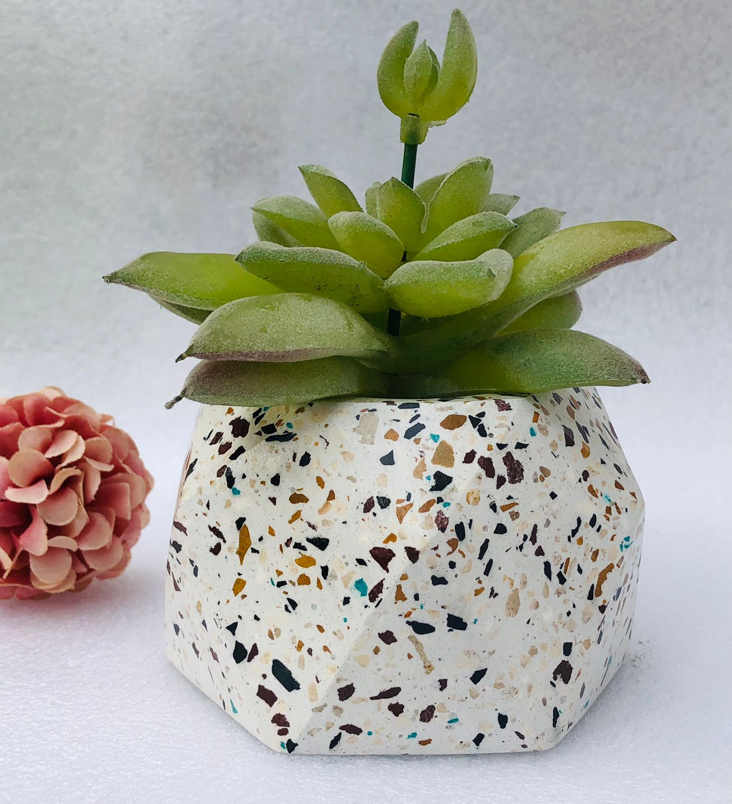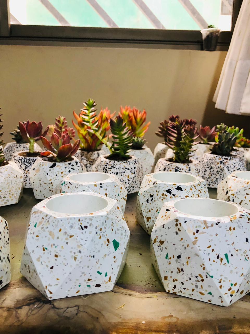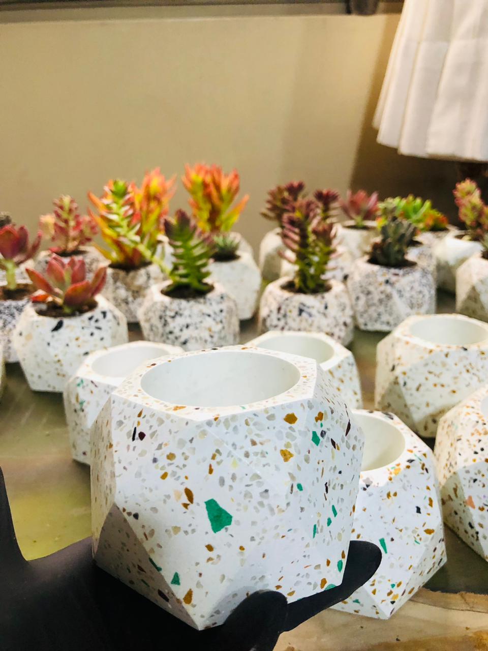 Maceta Hexagonal Terrazo, material cemento blanco con terrazo, altura 5.5cm, peso 450g