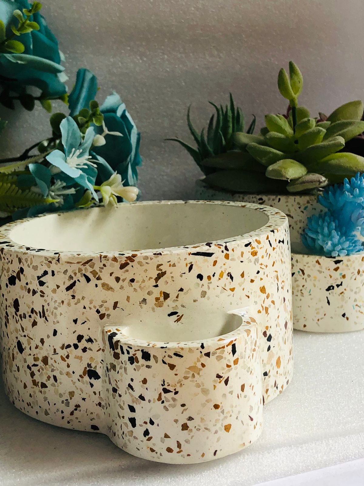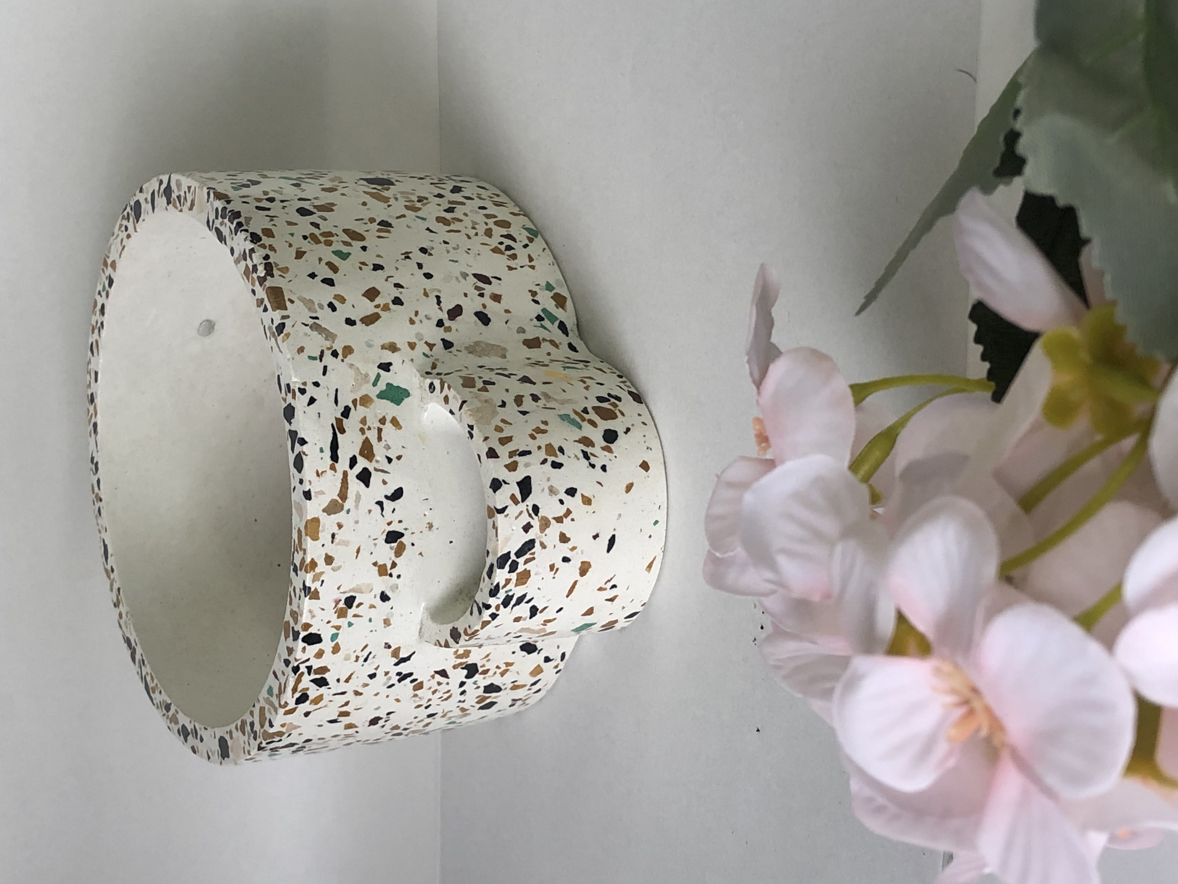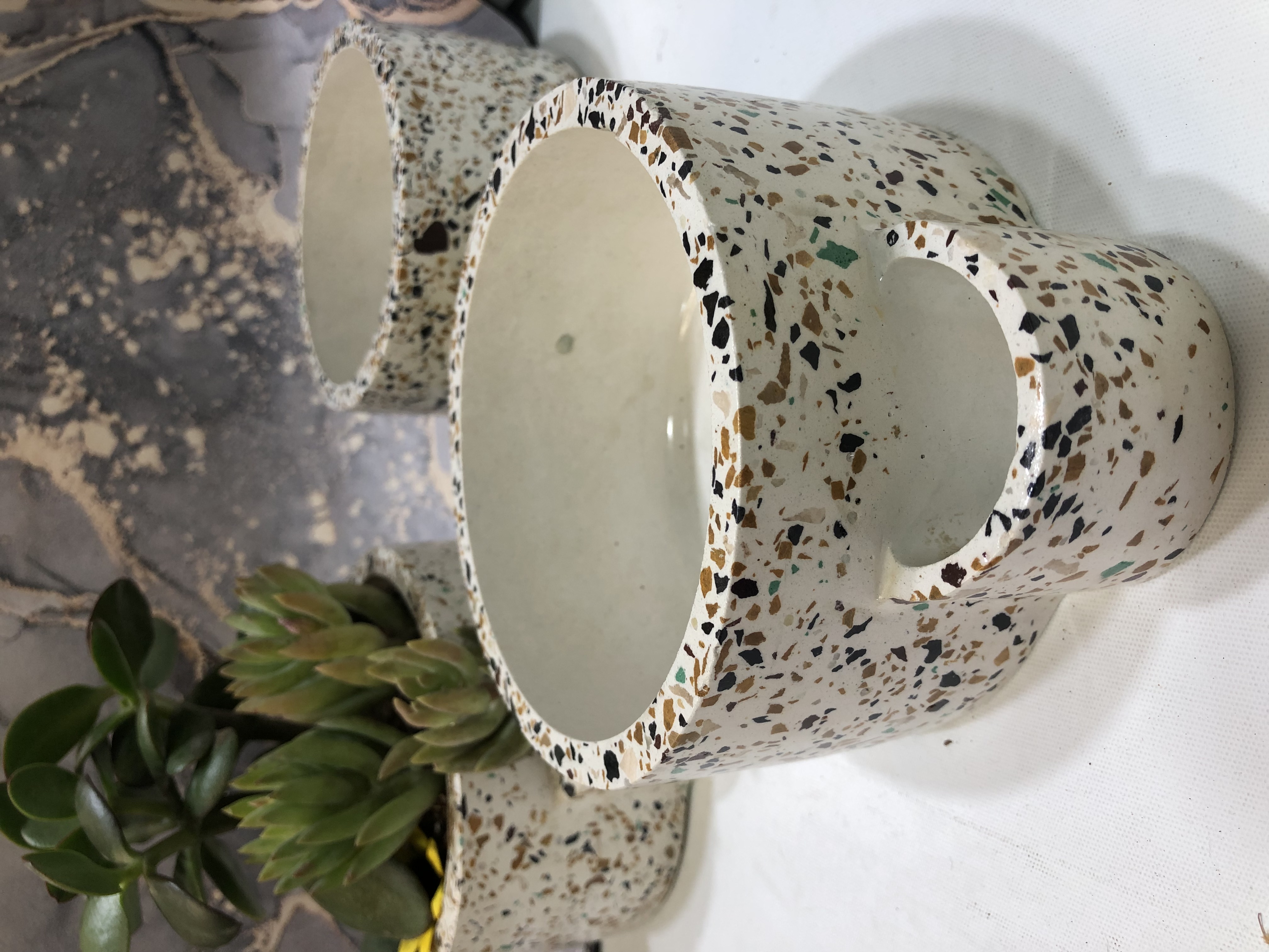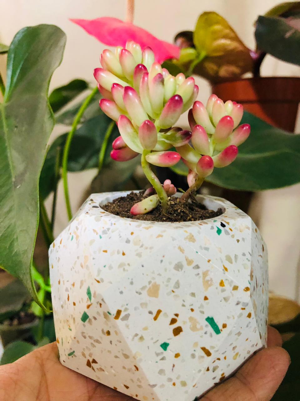 Maceta Hexagonal Terrazo, material cemento blanco con terrazo, altura 5.5cm, peso 450g