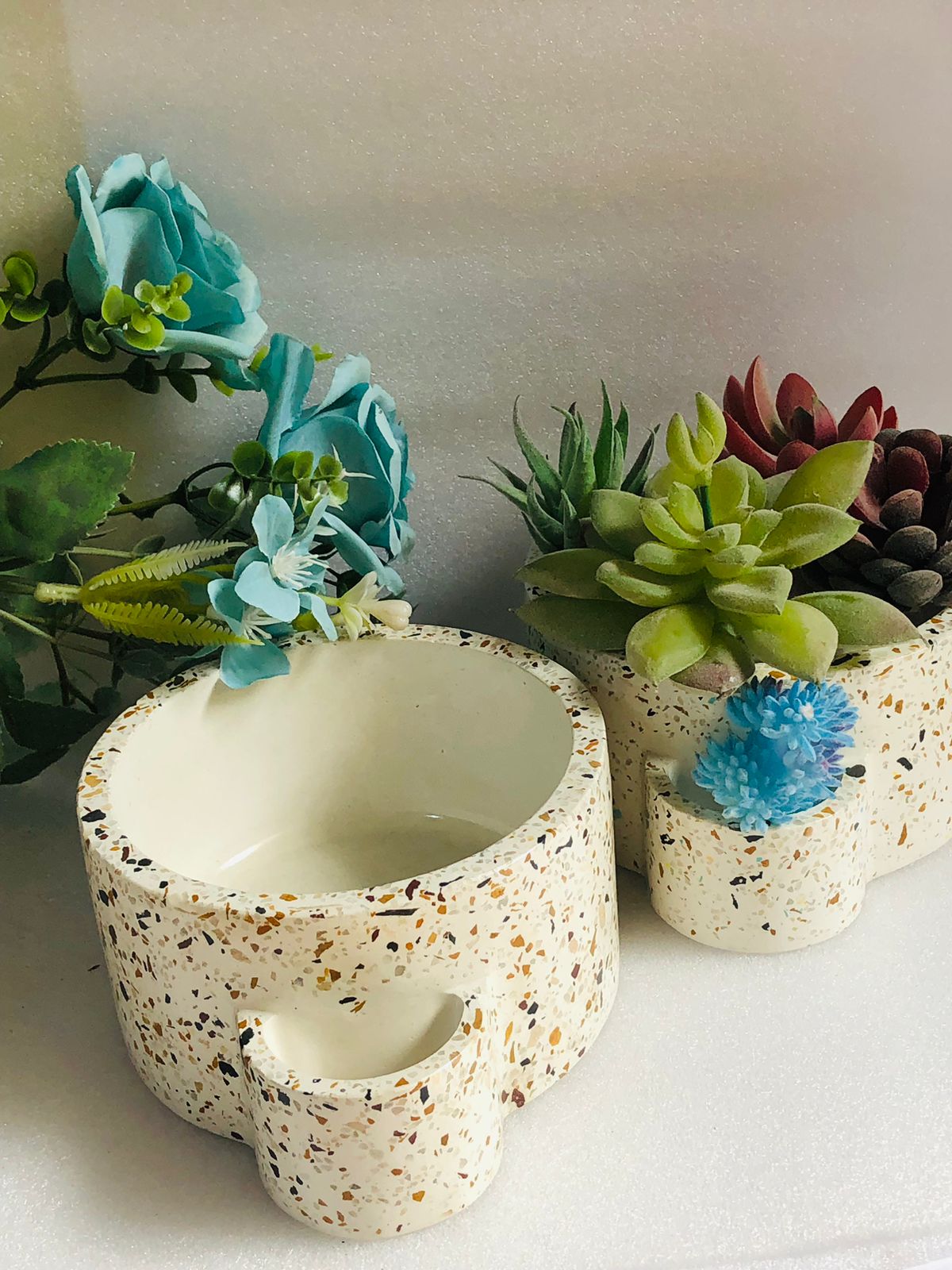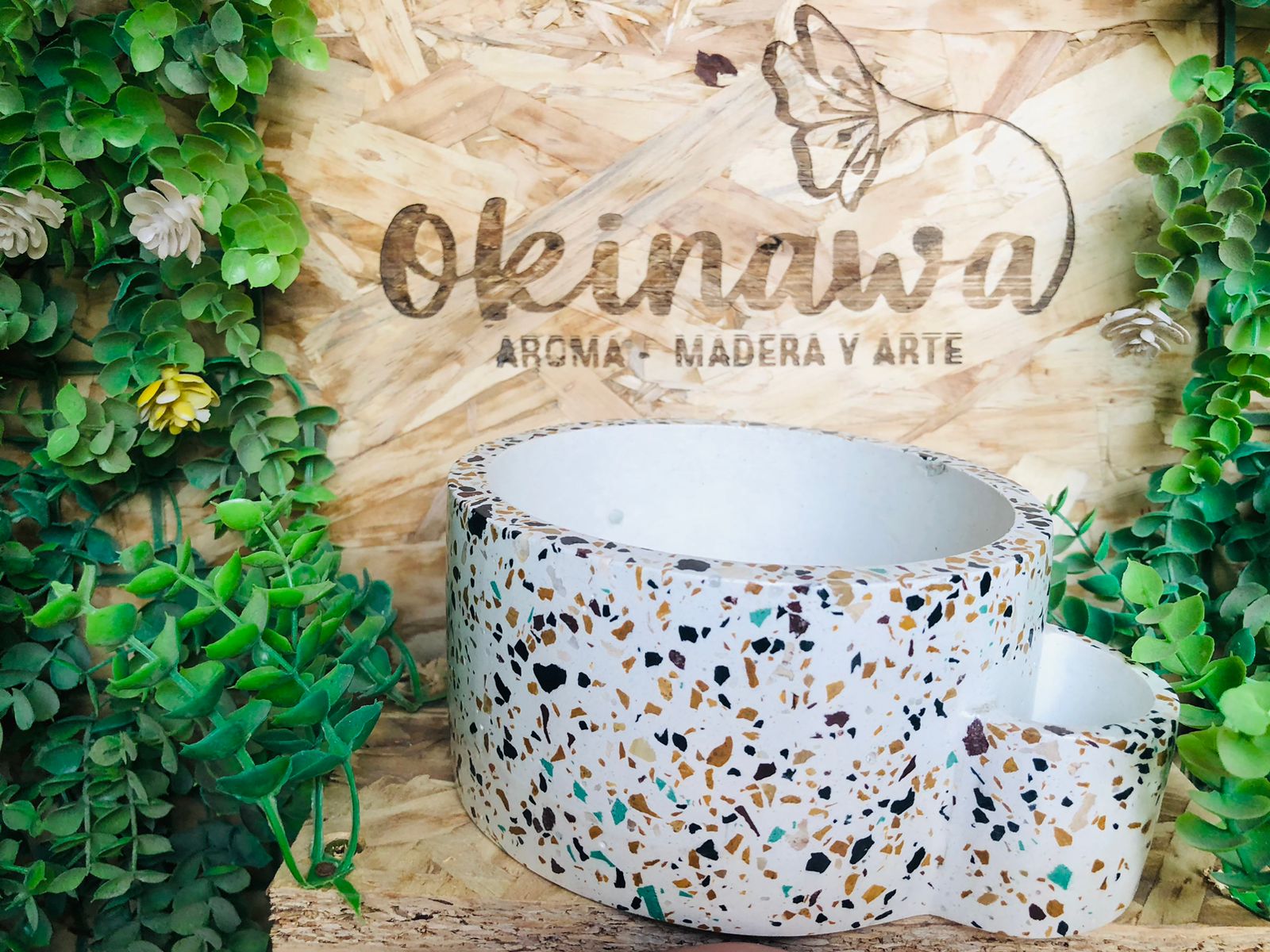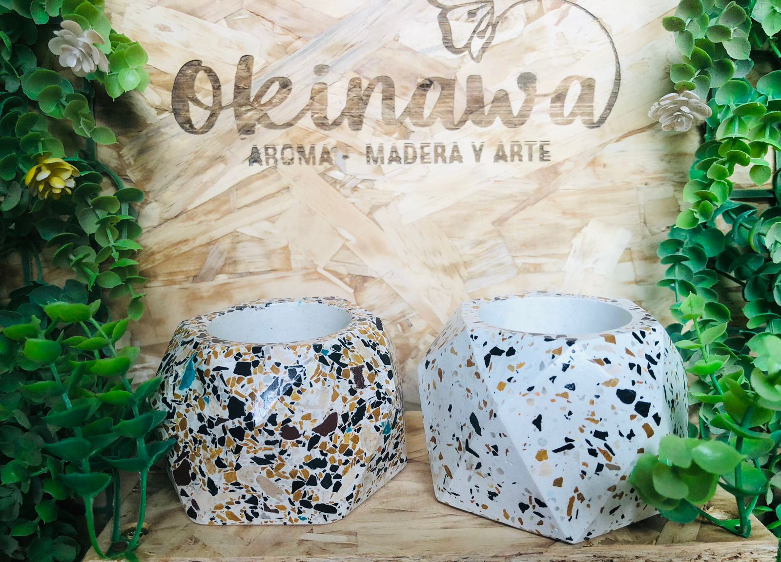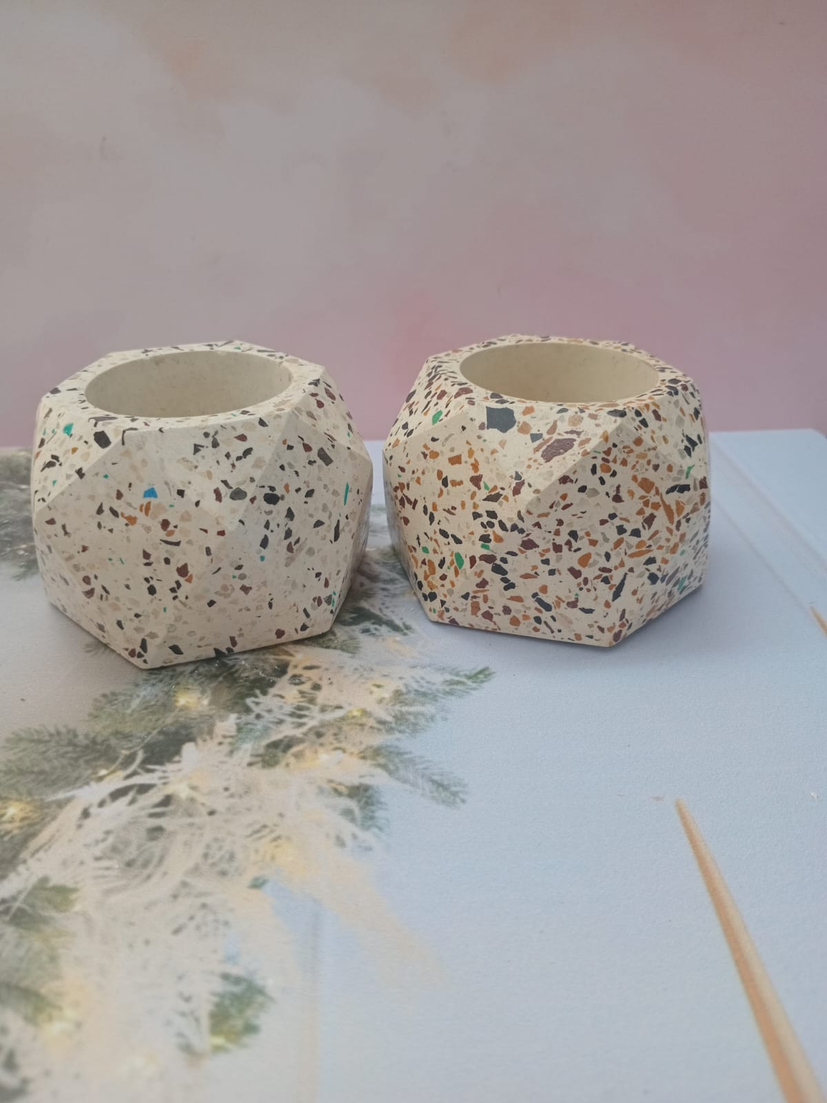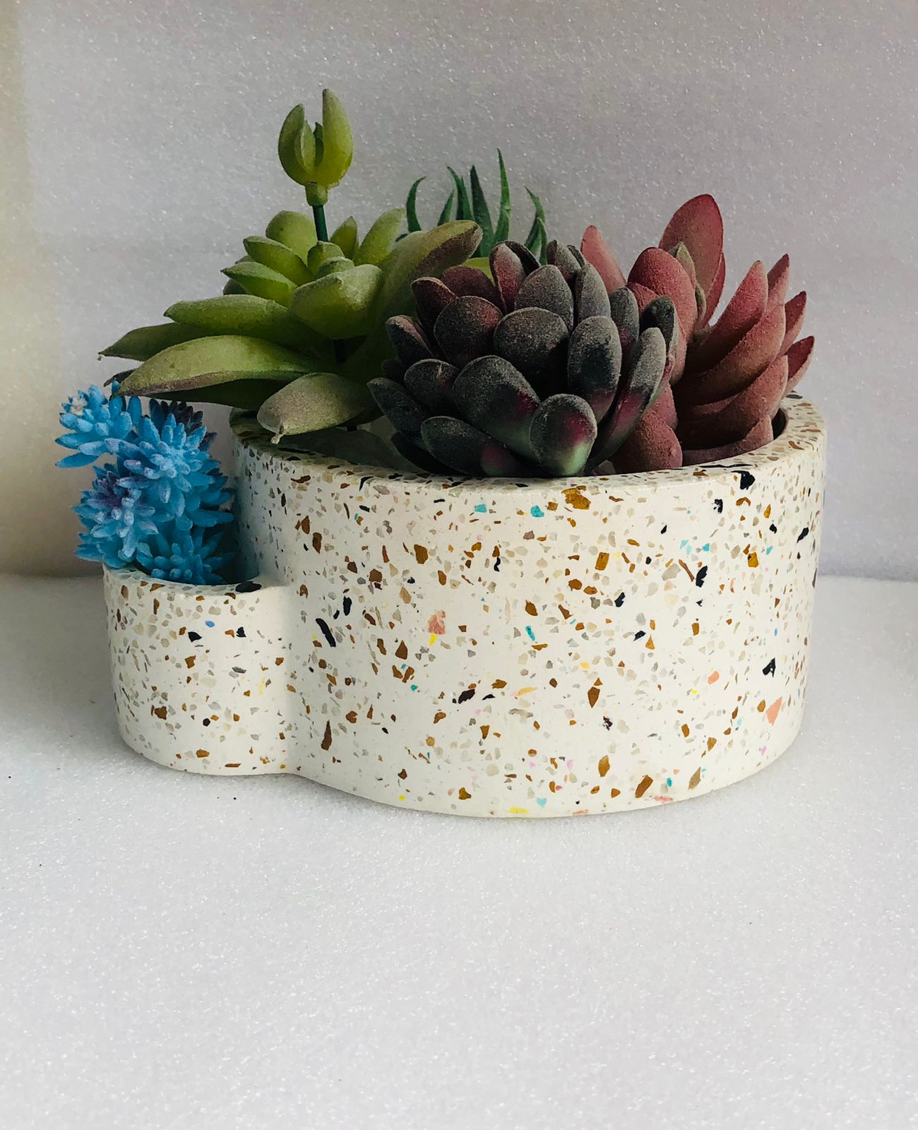 Maceta Hexagonal Terrazo, material cemento blanco con terrazo, altura 5.5cm, peso 450g