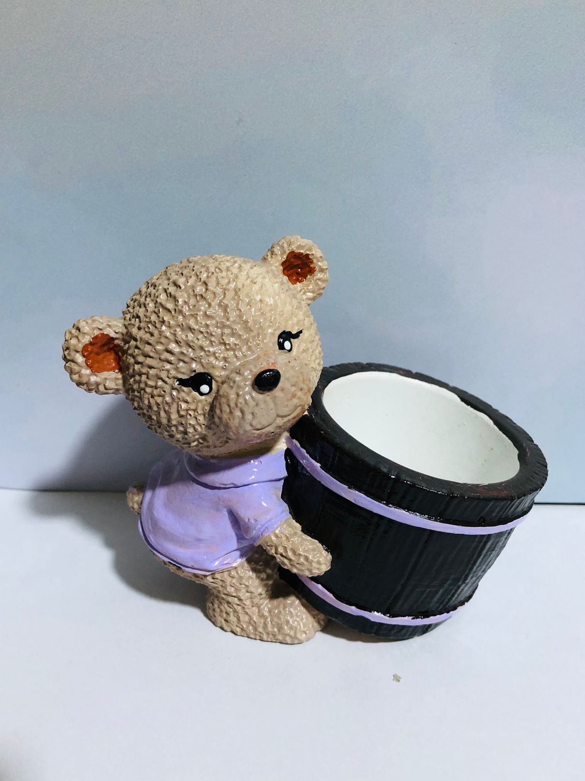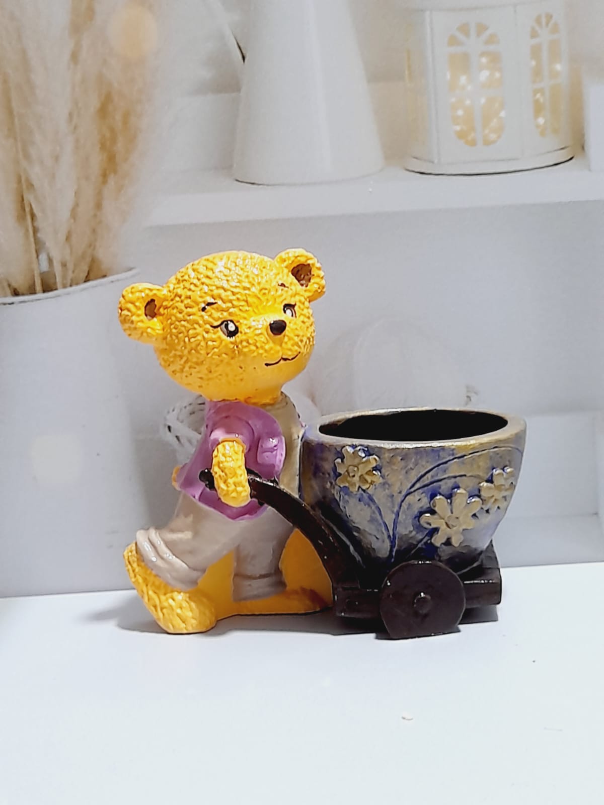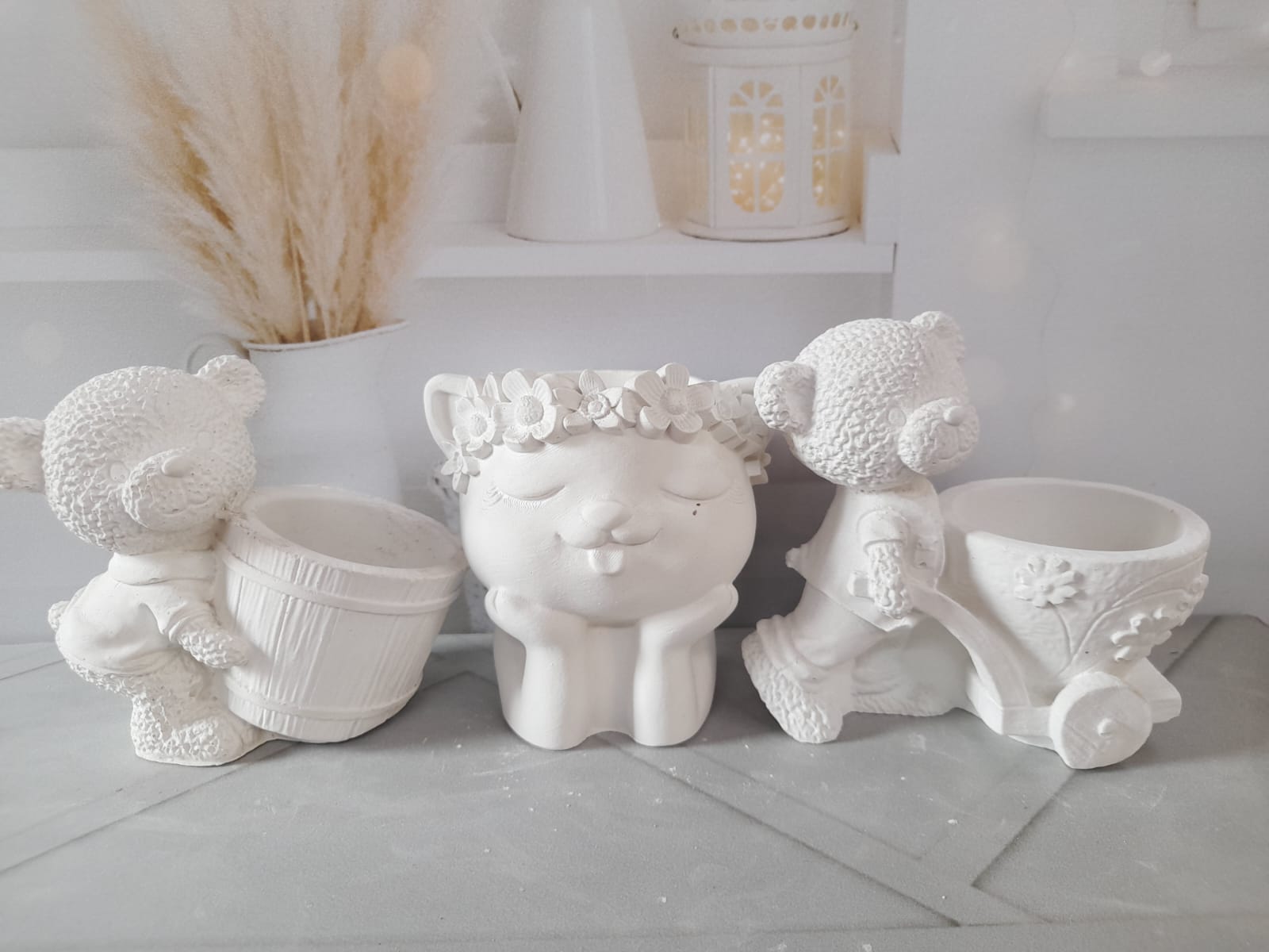 Maceta Oso Carretillero, material cemento blanco, altura 9.5cm, peso 270g