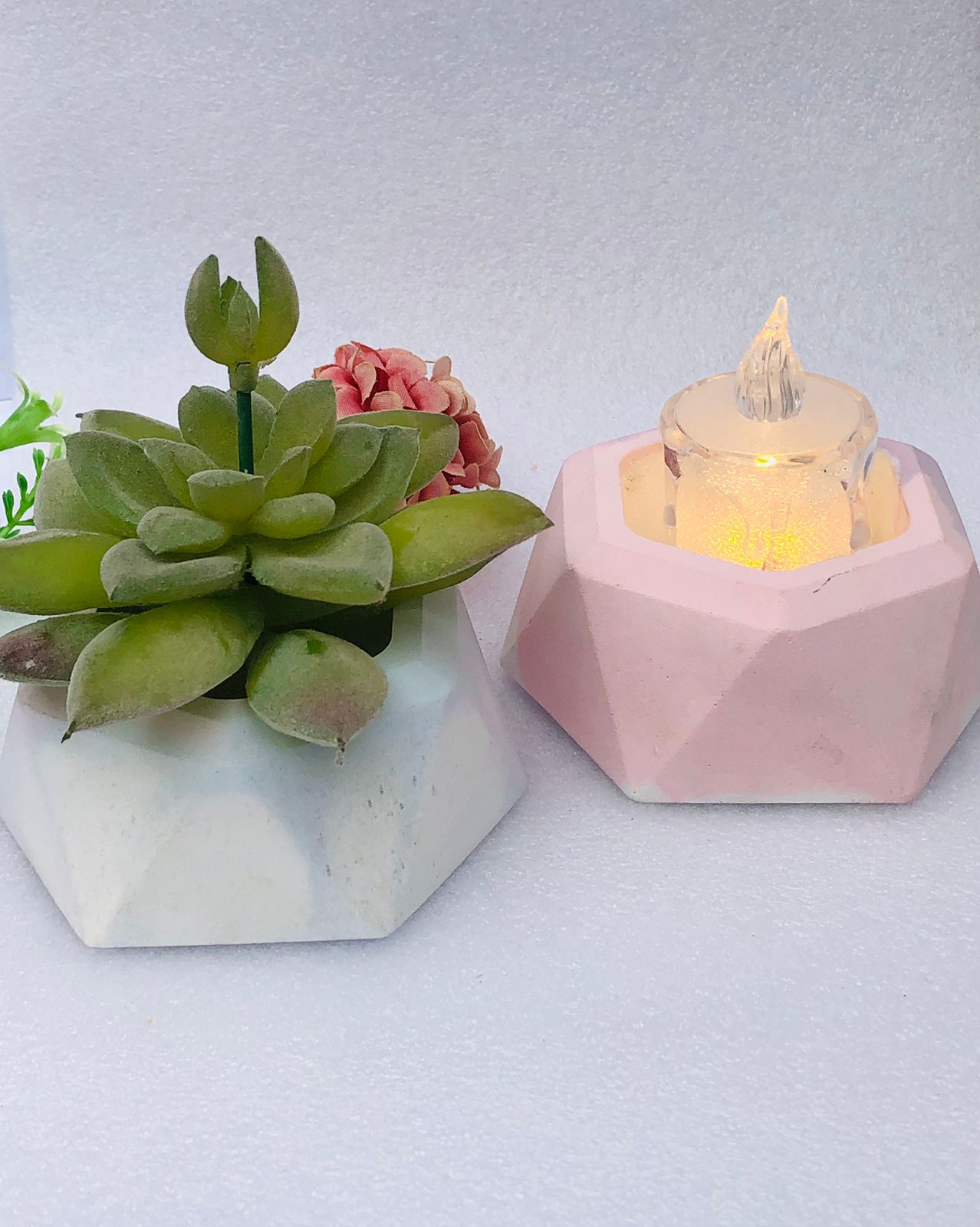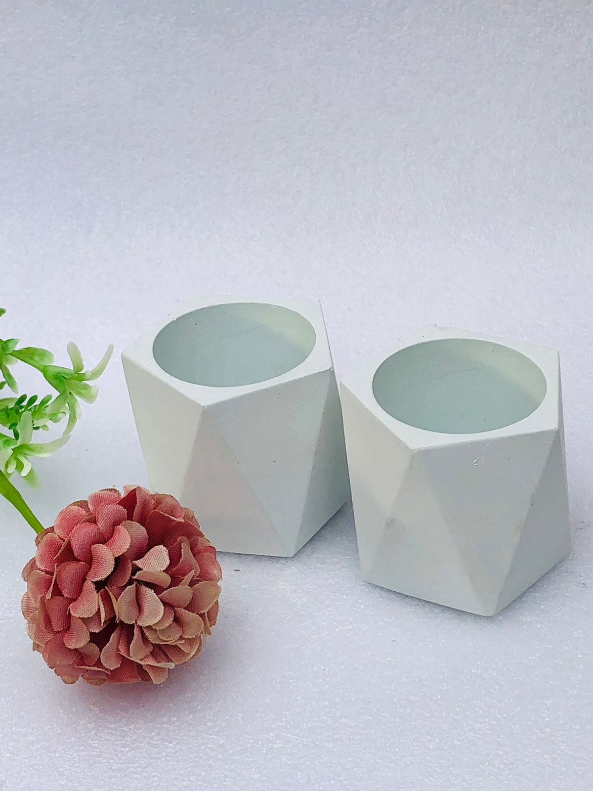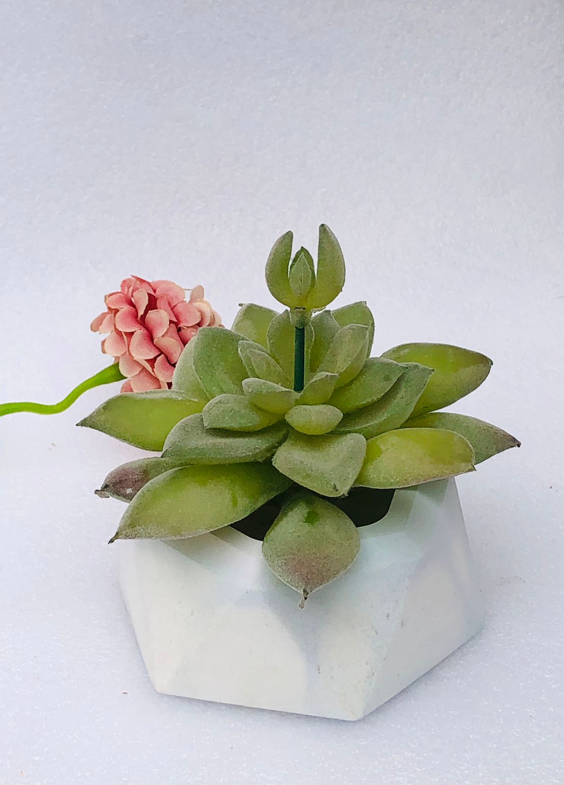 Macetita Mini Hexagonal, material cemento blanco, altura 4cm, peso 250g