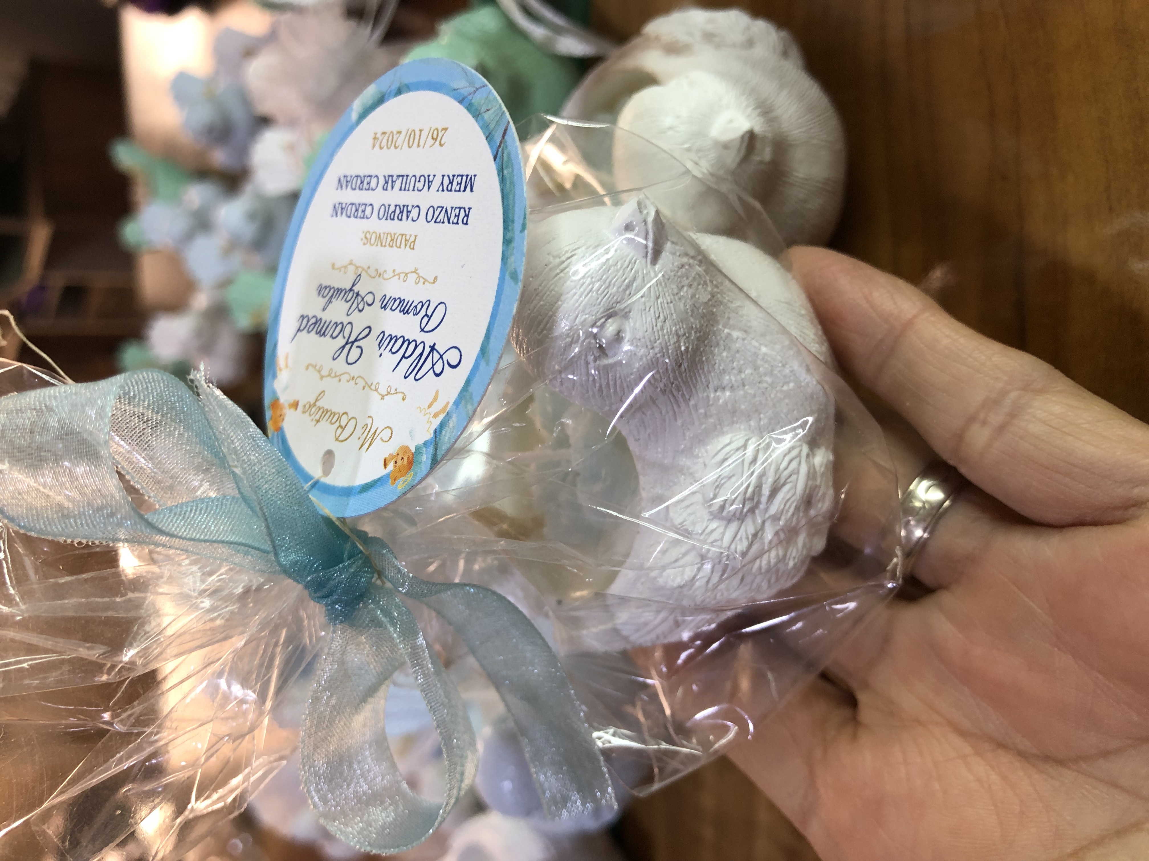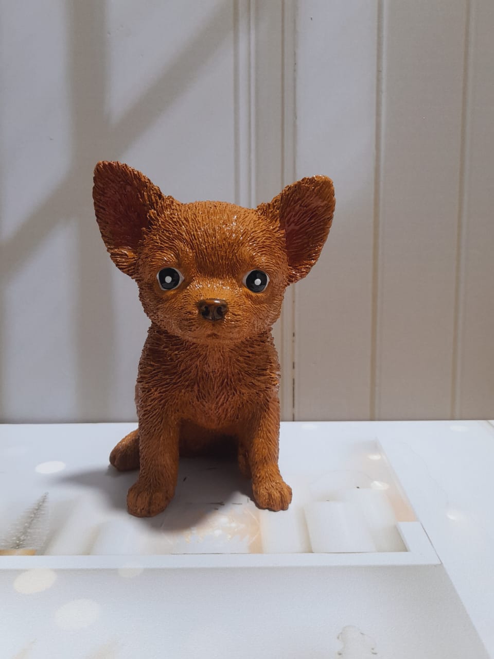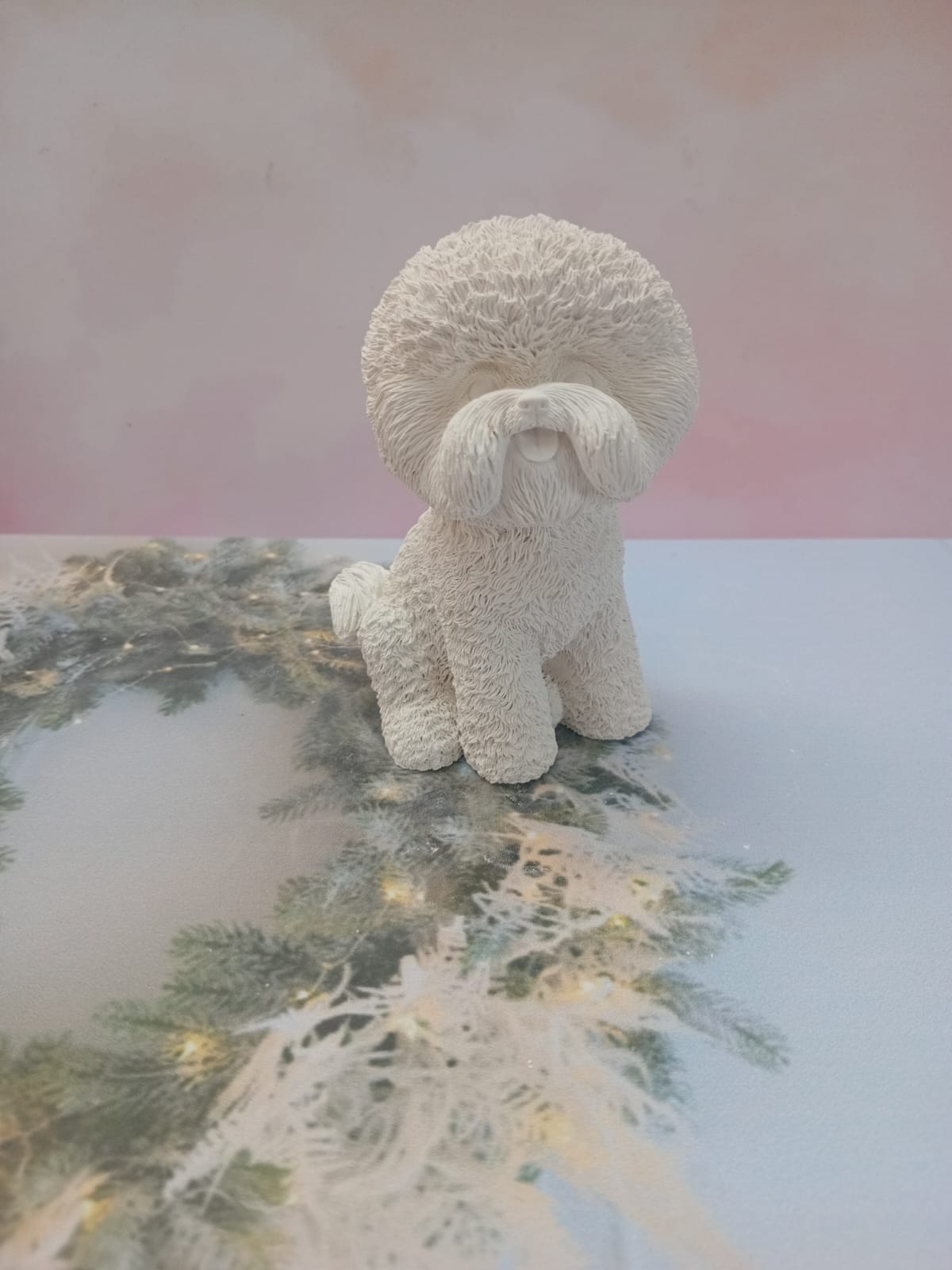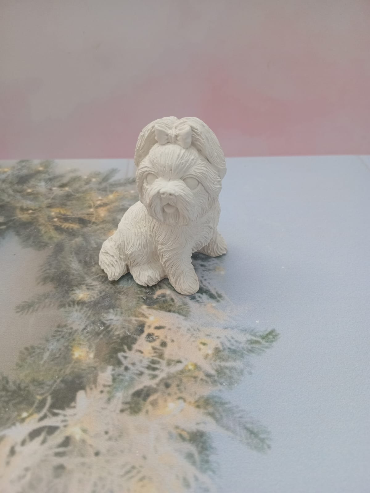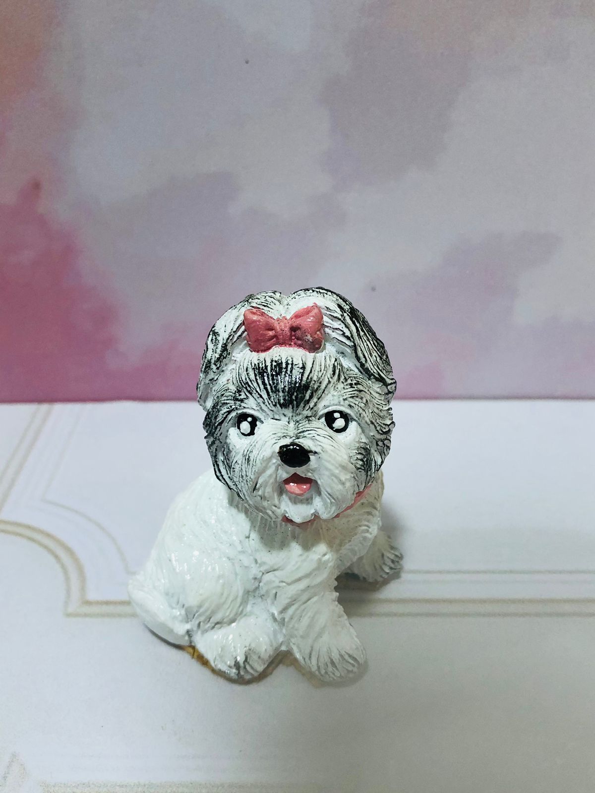 Figurita Shitzu con lazito, material cemento blanco, altura 6.5cm, peso 100g