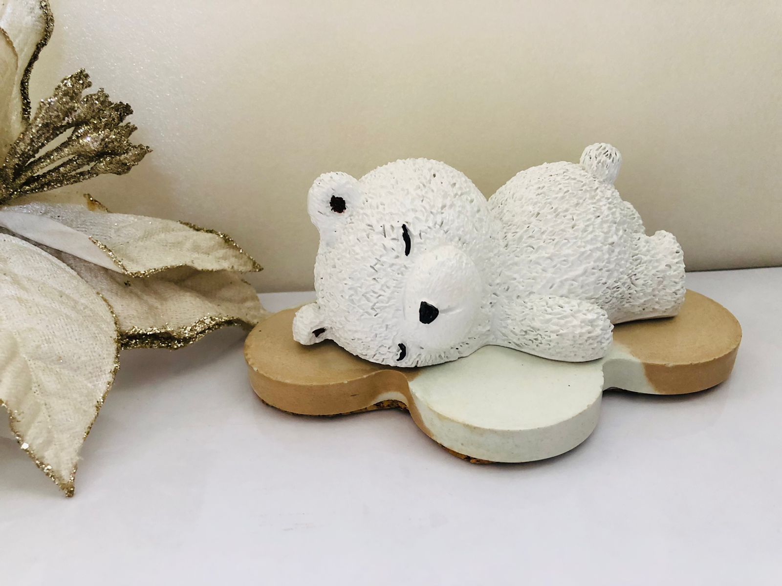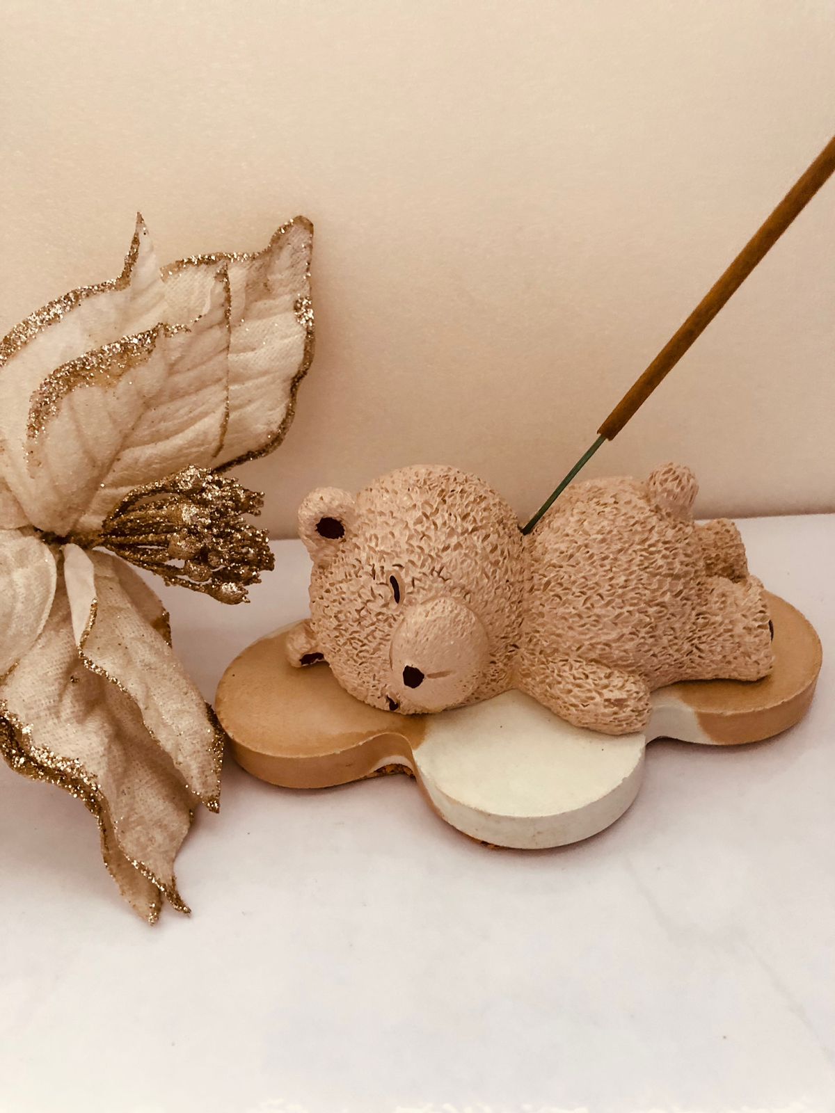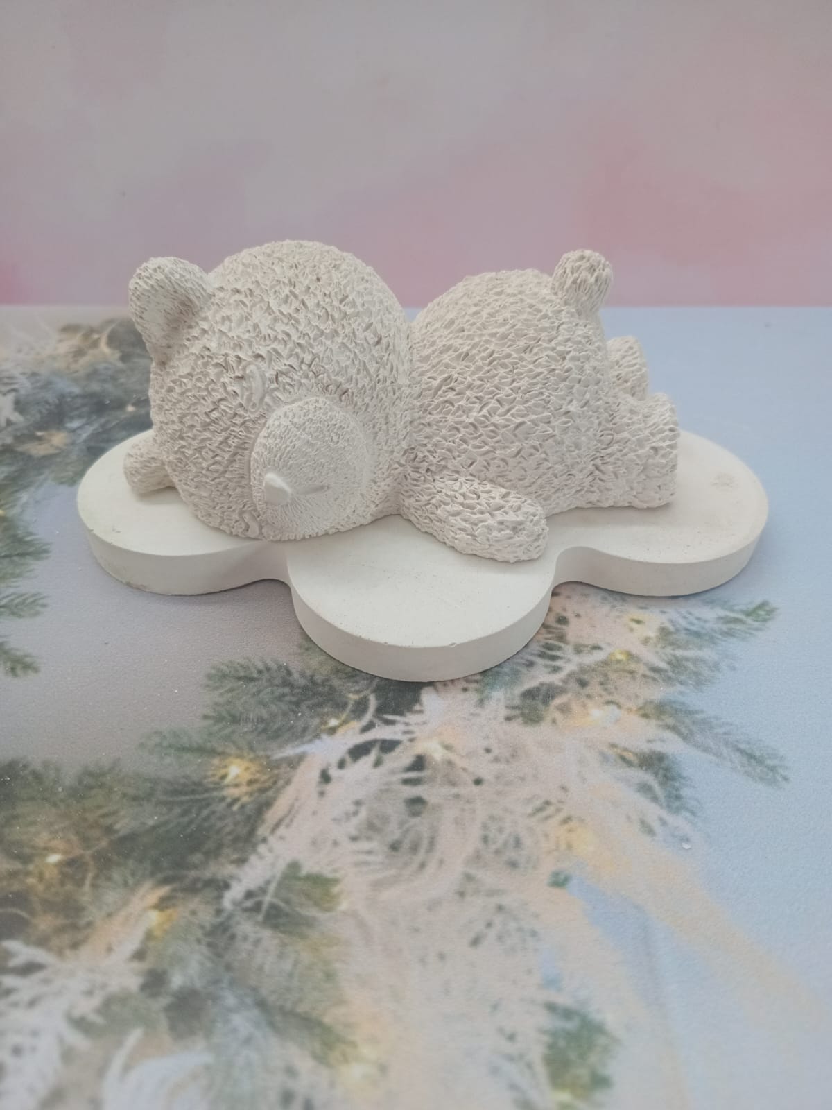 Porta Incienso Oso Dormilon con su base nube, material cemento blanco, peso 440g