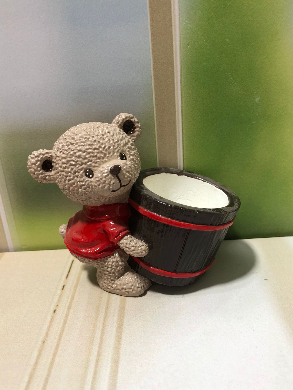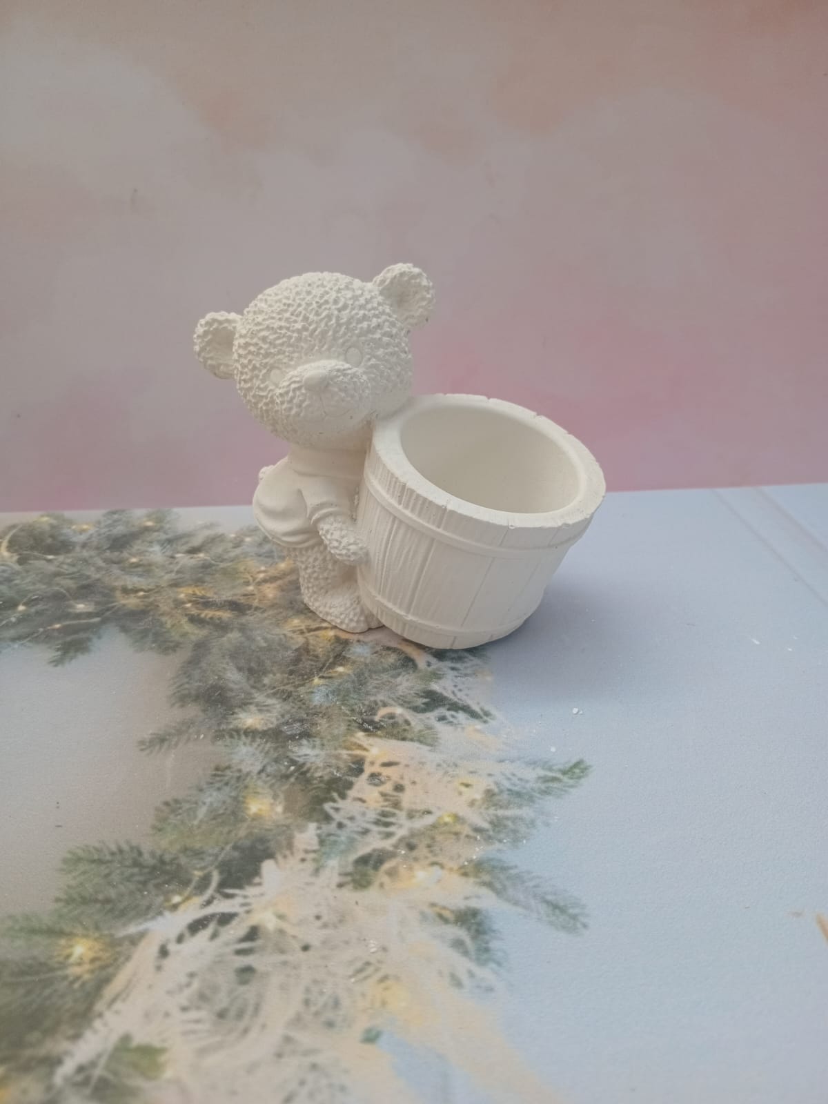 Macetita Osito con Barillito, material cemento blanco, altura 9cm, peso 260g
